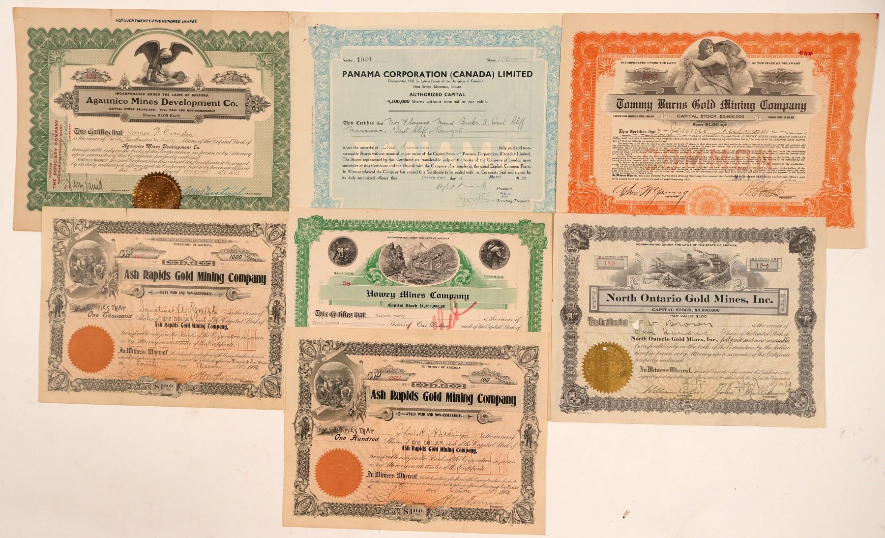 1) Tommy Burns Gold MC. # B387 for 4 shares. Located in the Porcupine Gold Fields. 2-3) Ash Rapids Gold Mining Company. Numbers 2525 and 3822, 1902 and 1903. Not cancelled. Located at Lake of the Woods in Kenora, Ontario. 4) North Ontario Gold Mines, Inc. # 180. Located at the Porcupine Gold Fields. Dateline 1931. Incorporated 1931. 5) Howey Mines. We make this to be an Ontario stock, although there are other Howey mines. Number 38. Dateline 1933. Red crayon cancelled. 6) Agaunico Mines Development Company. # 434 for 22,606 shares - a large number! Not cancelled. Dateline 1908. 7) Panama Corporation (Canada) Limited. Number 1024 for 100 shares. Dateline 1933. Not cancelled. Ken Prag Collection