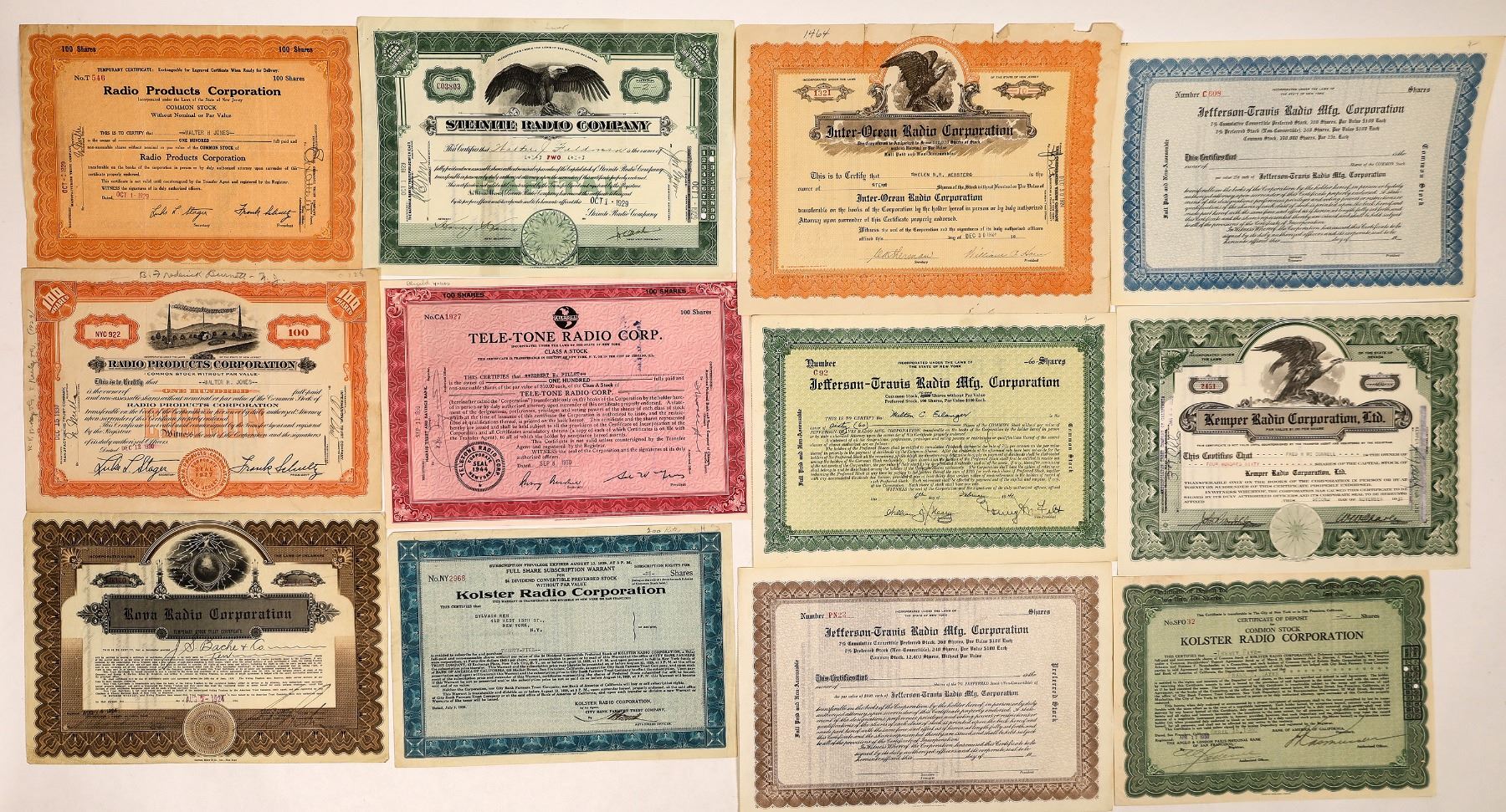 20 stock certificates issued by various radio broadcasting companies. They include Inter-Ocean Radio Corporation, Rova Radio Corporation, Radio Products Corporation, Steinite Radio Company and several more. Some are dated in the 1920's. Please see photos for more detail and condition.