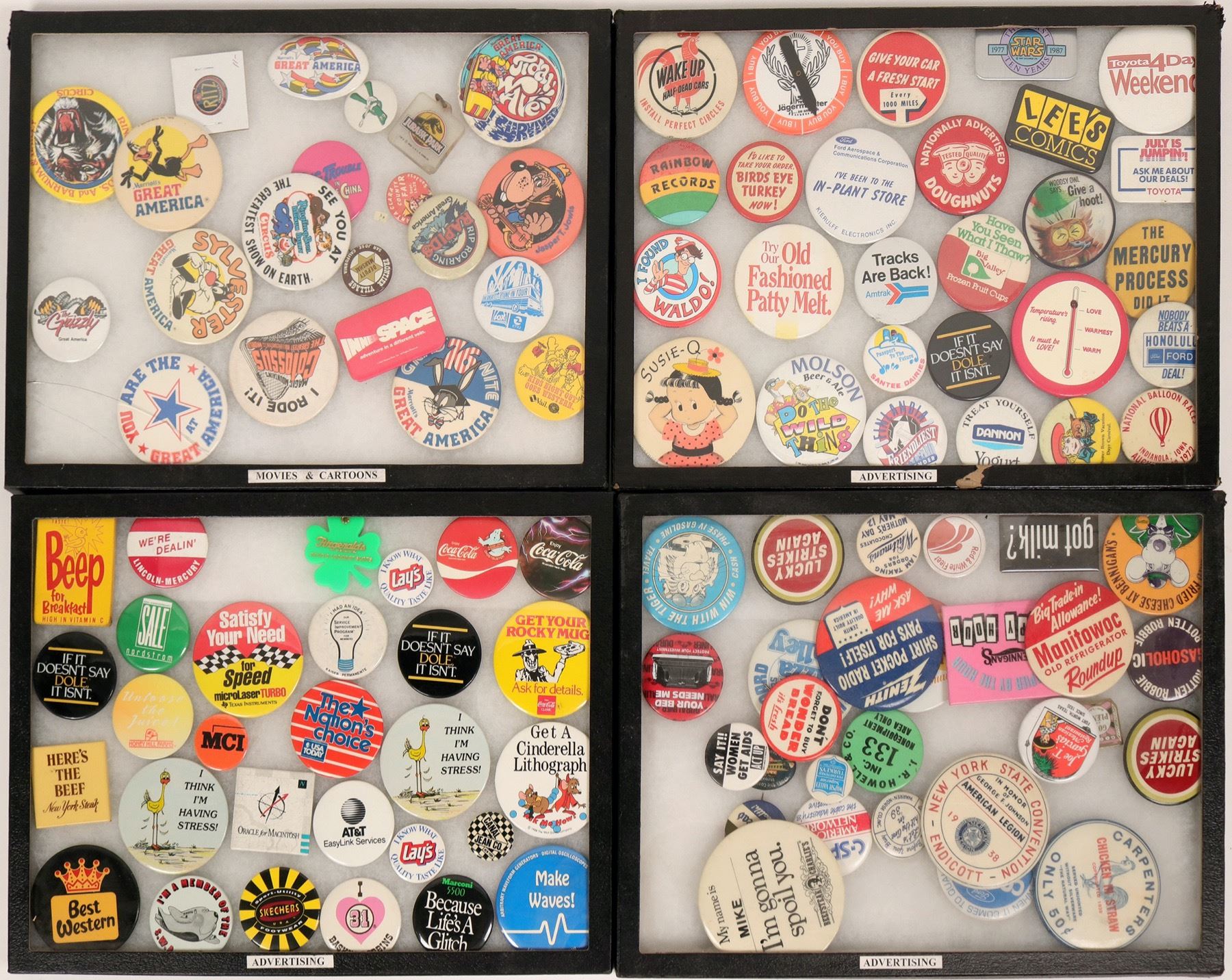 This lot has four trays filled with several pin backs and buttons focused on advertising. Products and services advertised include Amtrak, Molson Beer, Rainbow Records, cars dealers and more. All are in good condition. See photos for more details.