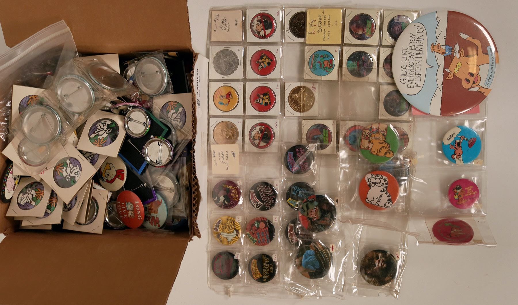 A large selection of pin backs all aimed at the younger set. This colorful collection includes super heroes like Teenage Mutant Ninja Turtles, Batman and others. There's also a Menudo button for those who remember.