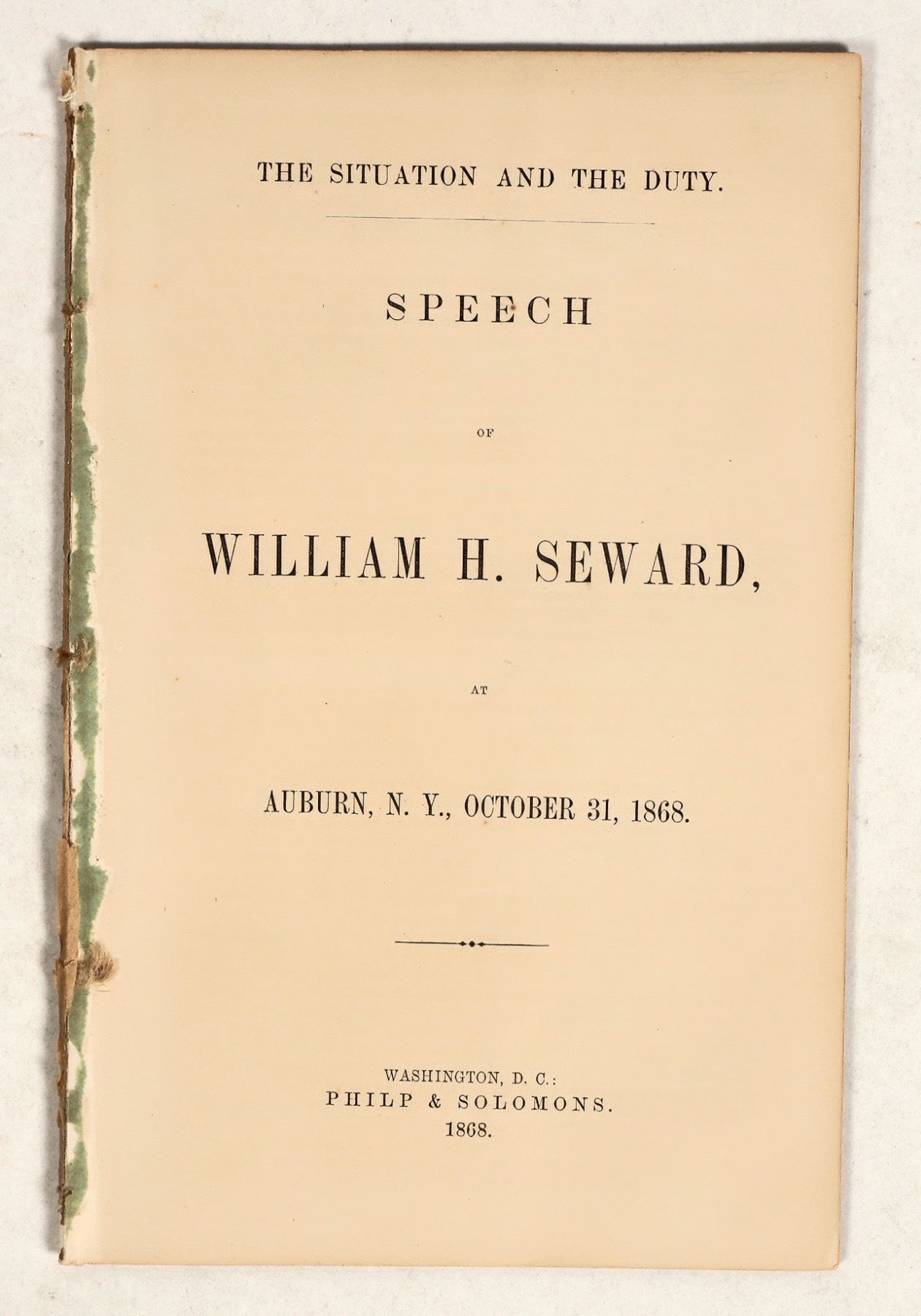 Pro-confederate speech transcript, given by William H. Seward in New York, 1868. The printing of the speech appears modern and seems to have been torn cleanly out of a larger book. Approximately 30 pages, in good condition though it is missing its spine and cover. See photo.