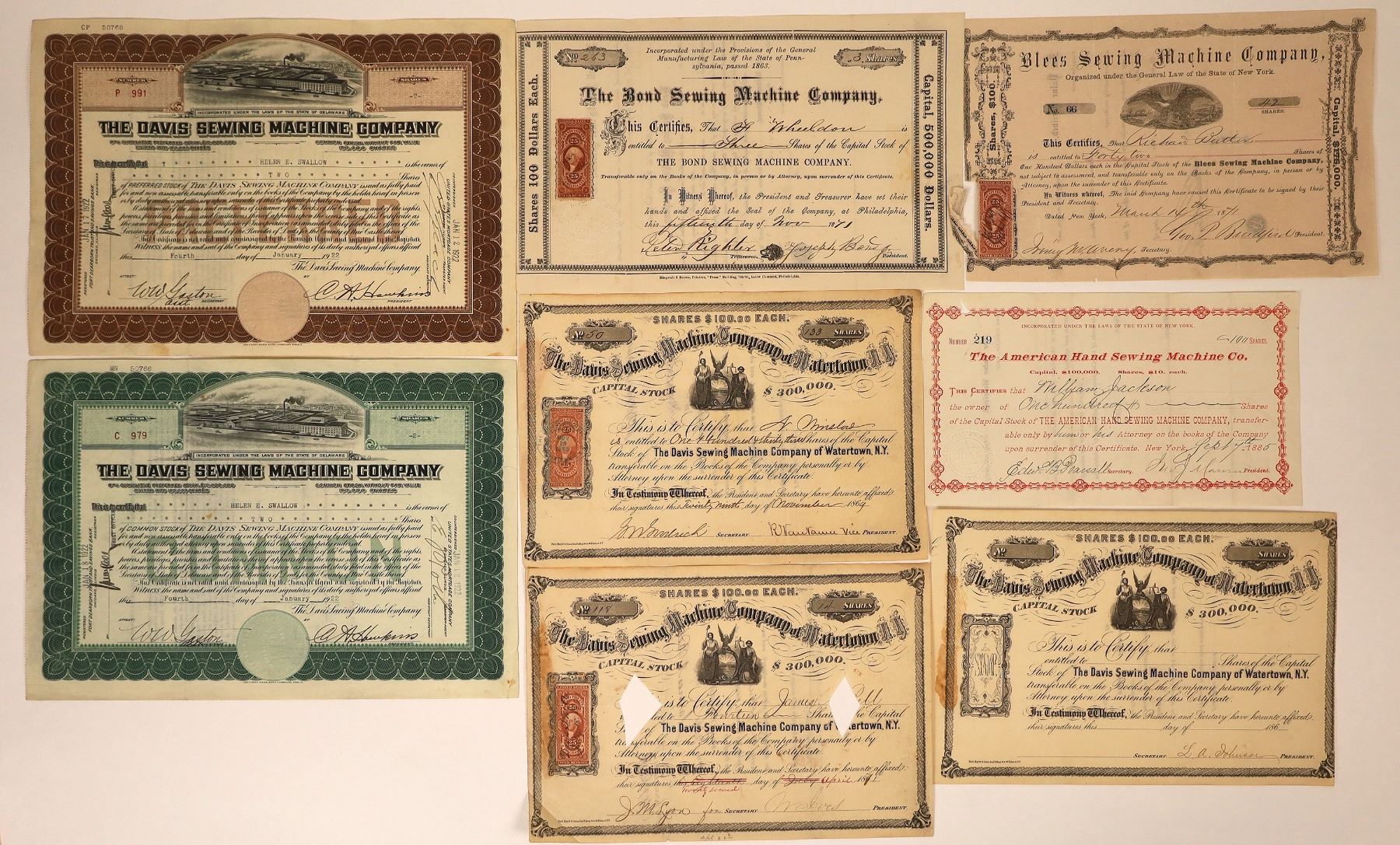 Eight sewing machine companies' stock certificates from eastern states, several with stamps, c1860s-1922. Included are: The Bond Sewing Machine Co., inc. PN, No. 263, 3 shares issued Nov. 15, 1871, to F. Wheeldon, signed by President Joseph Bond, Jr., and Treasurer Helen Righter, uncanceled, with stamp, fine cond. with 2 minor folds; The American Hand Sewing Machine Co., inc. NY, No. 219, 100 shares issued Sept. 7, 1885, to William Jackson, signed by President and Secretary, uncanceled, fine cond. with one small hole upper left and 2 minor folds; Blees Sewing Machine Co., inc. NY, No. 66, 42 shares issued March 14, 1871, to Richard Butler, uncanceled with stamp, eagle vignette, good cond. with small tear lower left and 2 minor folds; The Davis Sewing Machine Company of Watertown, NJ, blank & unissued but dated 186_, signed by President L.A. Johnson, Greek vignette of two women and eagle, fine cond. with 2 slight folds; The Davis Sewing Machine Company of Watertown, NJ, No. 118, 14 shares issued April 22, 1871, signed by President W. Ives and Secretary J.M. Lyon, canceled with stamp, Greek vignette of two women and eagle, fine cond. with diamond shaped cancels; The Davis Sewing Machine Company of Watertown, NJ, No. 50, 133 shares issued Nov. 29, 1869, signed by Vice-President and Secretary, uncanceled with stamp, Greek vignette of two women and eagle, fine cond. with 2 slight folds; The Davis Sewing Machine Co., inc. DE, No. C979, 2 shares issued Jan. 4, 1922, to Helen E. Swallow, signed by President C.A. Hawkins and Asst. Sec. W.W. Gaston, uncanceled, manufacturing plant vignette and embossed seal, fine cond. with 2 slight folds (2- one with green the other brown ornate borders).
