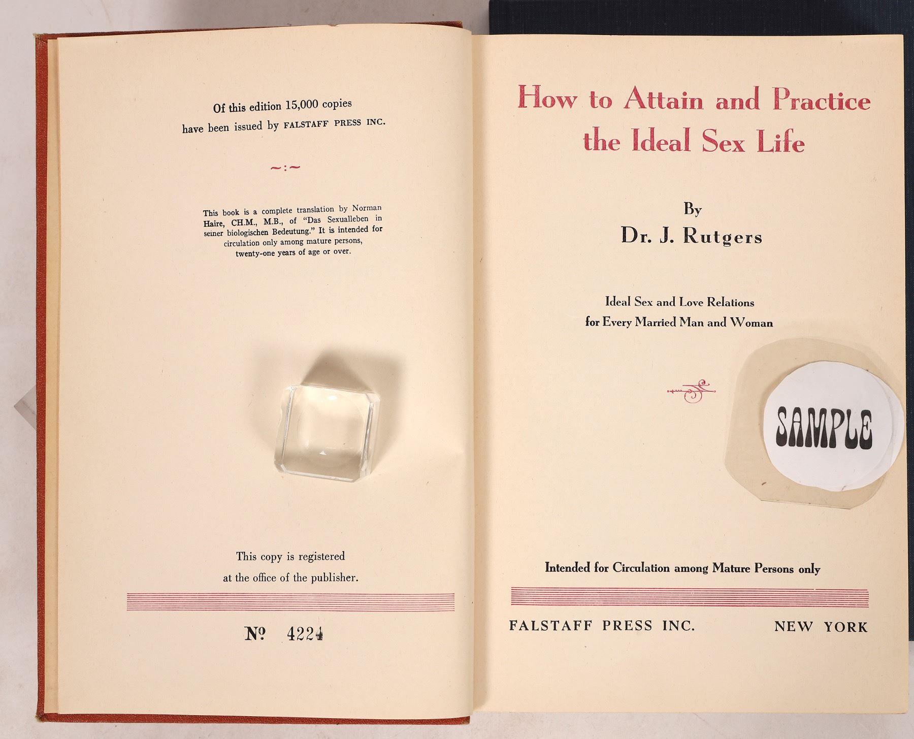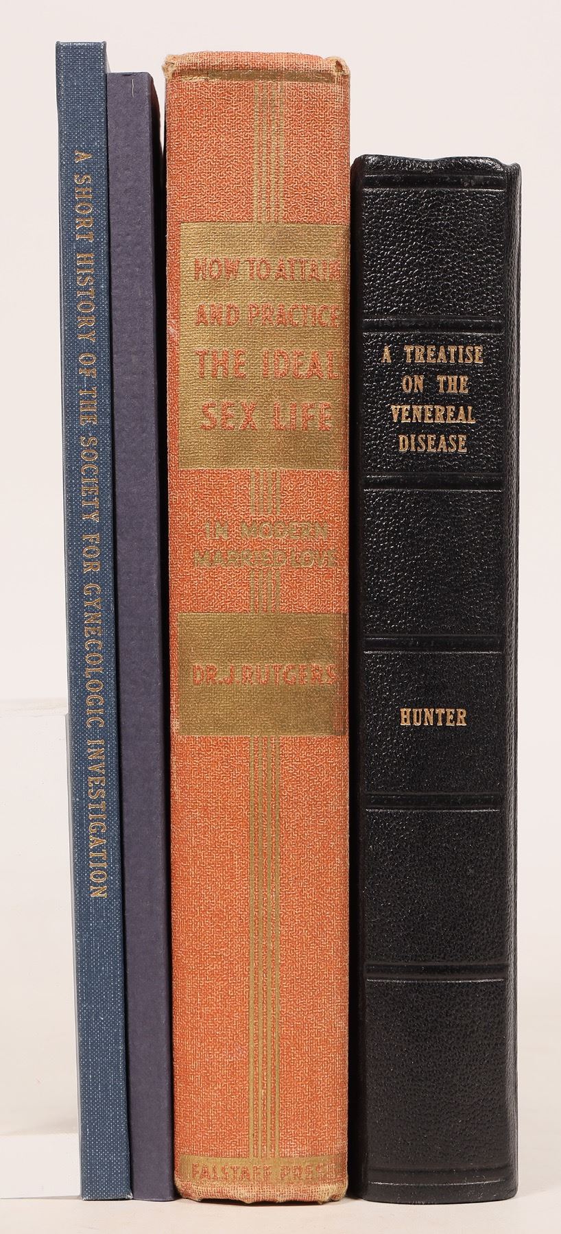 Rebound 1876 Treatise on Venereal Disease by Hunter, anatomical plates, some degradation to lower portion of first few pages, foxing. 1937 How to Attain and Practice the Ideal Sex Life by Rutgers, A Short History of the Society for Gynecologic Investigation 1953-83 by Longo in hard and soft covers.