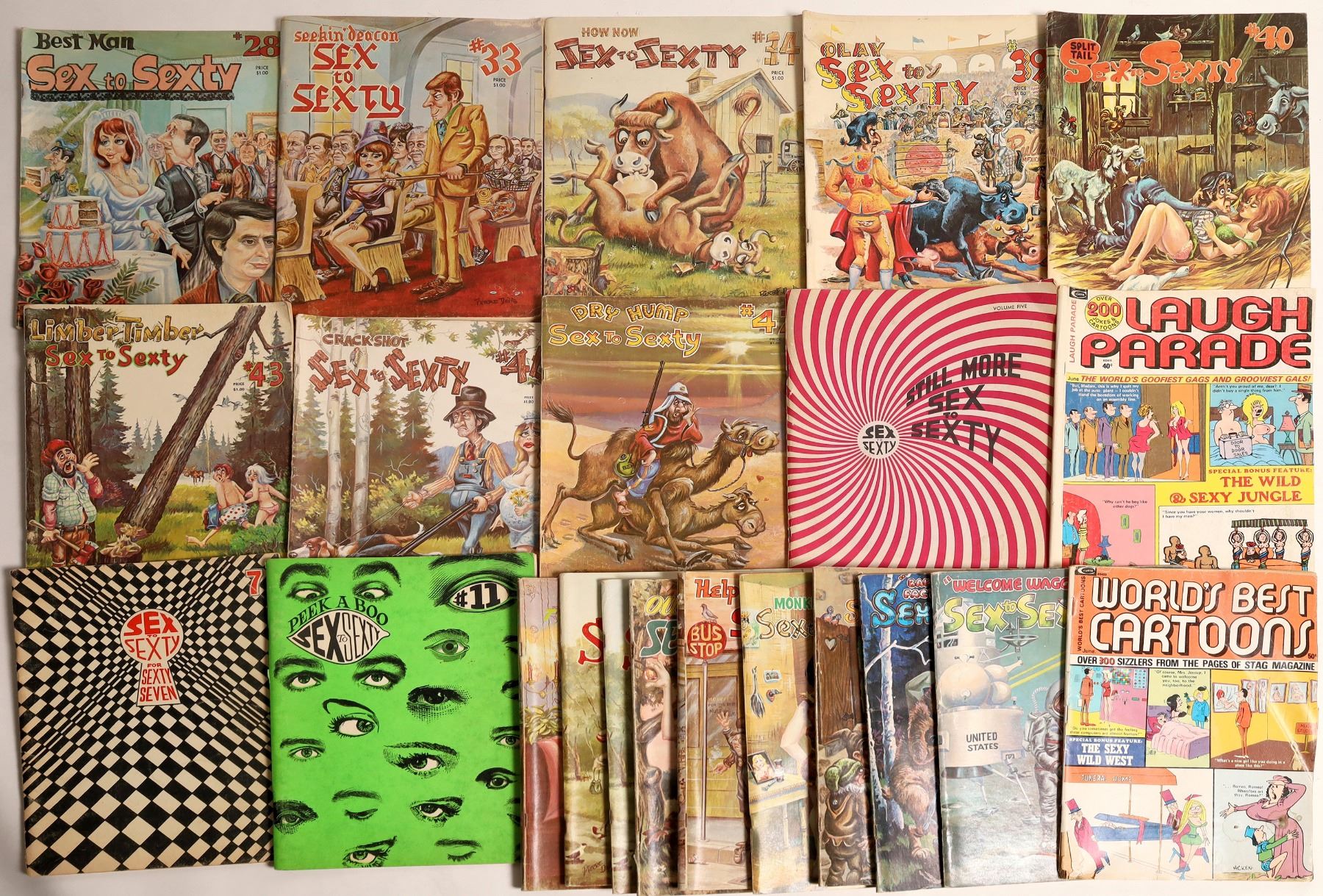 This is a lot of 20 issues of Sex to Sexty Magazine. Each issue has a different story-line attached. The earliest issue is # 5 from 1966 "Still More Sex to Sexty" and ends with issue #64 in 1975 "Welcome Waggin". This was the MAD Magazine of sexual content. All of it in good humor during the Vietnam War years and gives meaning to "Make Love Not War". These issues are typically 60 some pages of cartoons, stories, and jokes. The art work looks like pure fun in misguided talent.