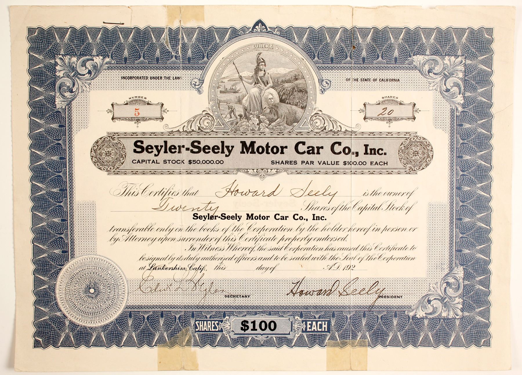 20 shares of Seyler-Seely Motor Car Co., Inc cert. #5 issued to and signed by, pres. Howard Seely and Edwin L. Seyler. Assigned May 29, 1922 by Howard Seely. Blue border and raised company seal. Unique vignette of women with staff, shield and wolf with workers and boat in background. Inc CA. Small tears, one on seal, staple and taped areas. This company, like many others of this time period, started small and may have only lasted a few years and maybe in a limited number of states. No information on the company as to dates of operation, owners, even states in some cases, earlier name and if they consolidated with another company, went into bankruptcy or just closed. Prag collection.