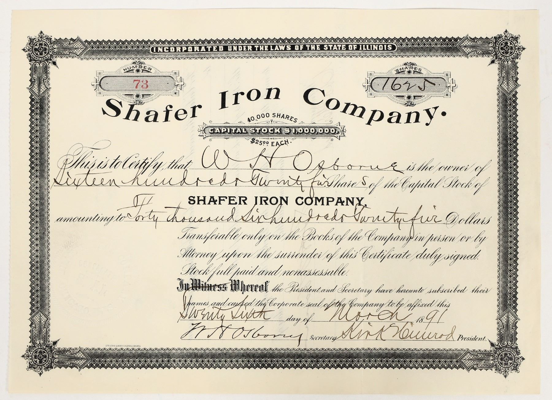 Inc. in Illinois. No. 73, issued for 1625 shares to secretary WH Osborne in 1891. Signed by Osborne and the president (illegible). Not cancelled. Folds. Located at Crystal Falls, Iron County, Michigan (confirmed by 1890s newspaper articles).