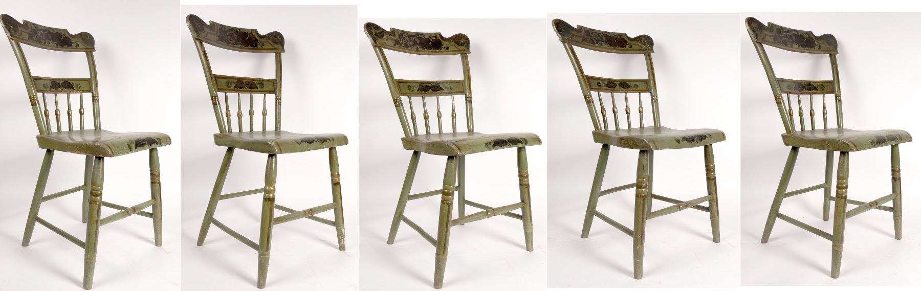Set of 5 c. mid 1700's original paint and construction Shaker wood chairs. Mostly green with yellow and black accents. Fruit pattern on seating side of backs. 33x16x15". One chair has a 3" crack on back of seat base. Unrestored, please inspect before using as seating. Local pickup preferred.