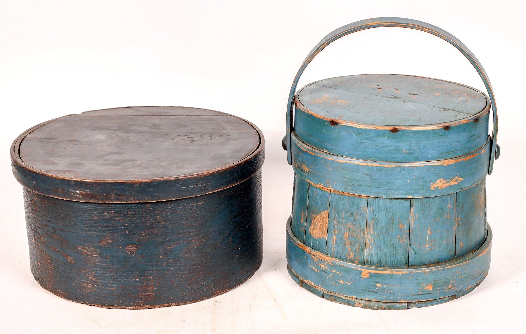 Shaker firkins, or buckets (2). These were constructed by the Shakers, The United Society of Believers in Christ's Second Appearing, commonly known as the Shakers, was a Protestant sect founded in England in 1747. The French Camisards and the Quakers, two Protestant denominations, both contributed to the formation of Shaker beliefs. Because of their commitment to celibacy, it was no surprise that they faded from existence, with the last two surviving members reported living in Maine in 2017. These are made of wood and measure11"x 11" and8"x15", They are very nice condition, save for some loose staves, considering their age, but their water carrying days are over. Please see photos for more details.