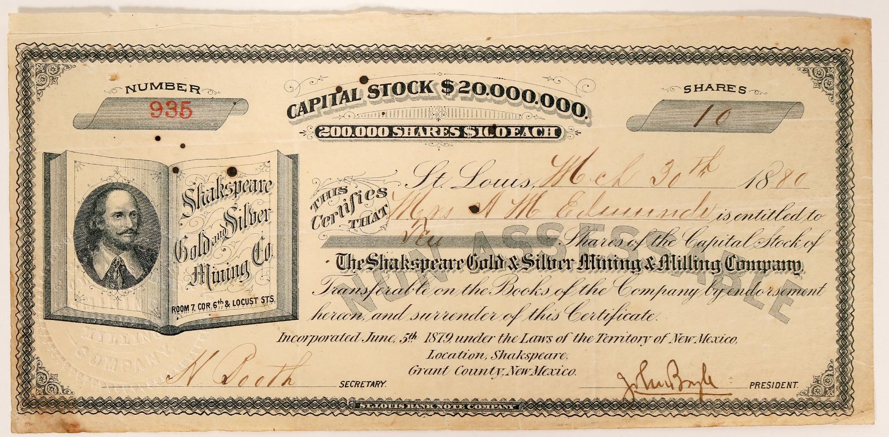 UNIQUE book vignette with shakespeare portrait, company title and location. St. Louis Bank Note printer. Not Cancelled. # 935 for 100 shares t Mrs. AM Edwards. Signed by H Booth and president John Boyle. Dateline St. Louis 1880. Incorporated June 5, 1879. Discoloration throughout. Tear upper left. "Around 1870, the area that would eventually become Shakespeare had attracted a number of prospectors always on the look-out for mineral deposits. When a couple of them found rich silver ore, they contacted San Francisco businessman and financier, William Ralston, co-founder of the Bank Of California six years earlier. When the prospectors were successful in gaining Ralston’s financial support to develop the mines, the resulting settlement was named Ralston in his honor...Though the New Mexico Mining Company found a few isolated pockets of silver ore, William Ralston’s credibility was quickly waning due to his involvement in several dicey scams, one of which was the Great Diamond Hoax of 1871. His stock dropped dramatically and people began to leave the newly formed camp. By 1873, there were only a few people left in the boom town...In 1879, though the town of Ralston was virtually non-existent, another investor, Colonel Boyle of St. Louis, Missouri, staked a number of claims under the name of the Shakespeare Mining Company and renamed the settlement, Shakespeare. Mining was in full force again with the principal mines being Boyle’s Shakespeare Gold and Silver Mining and Milling Company. [legendsofamerica.com] Ken Prag Collection