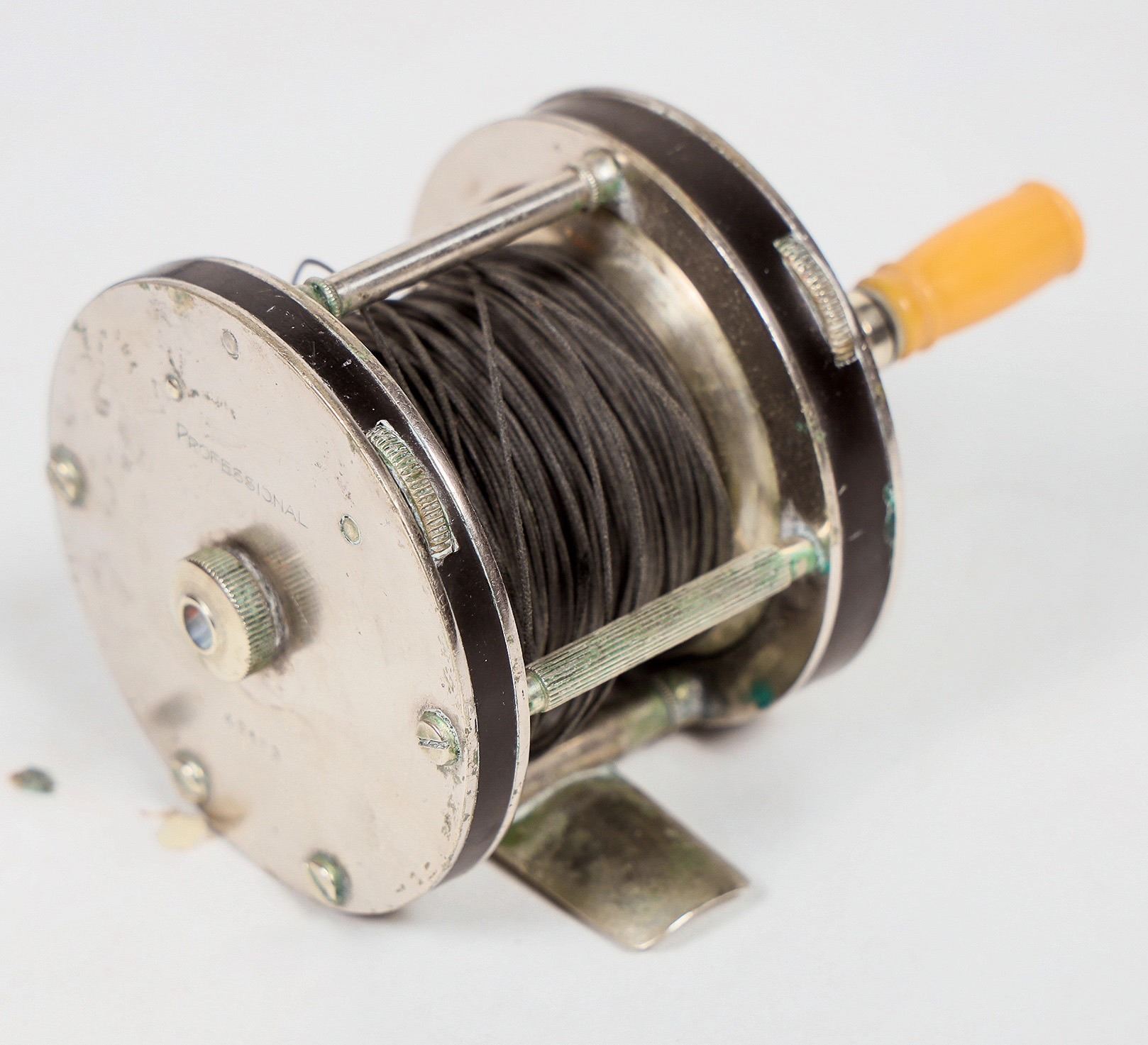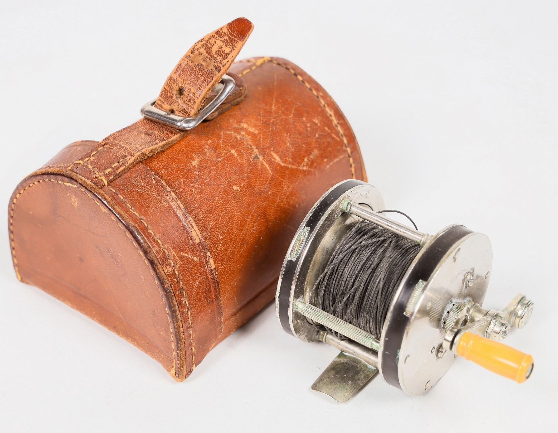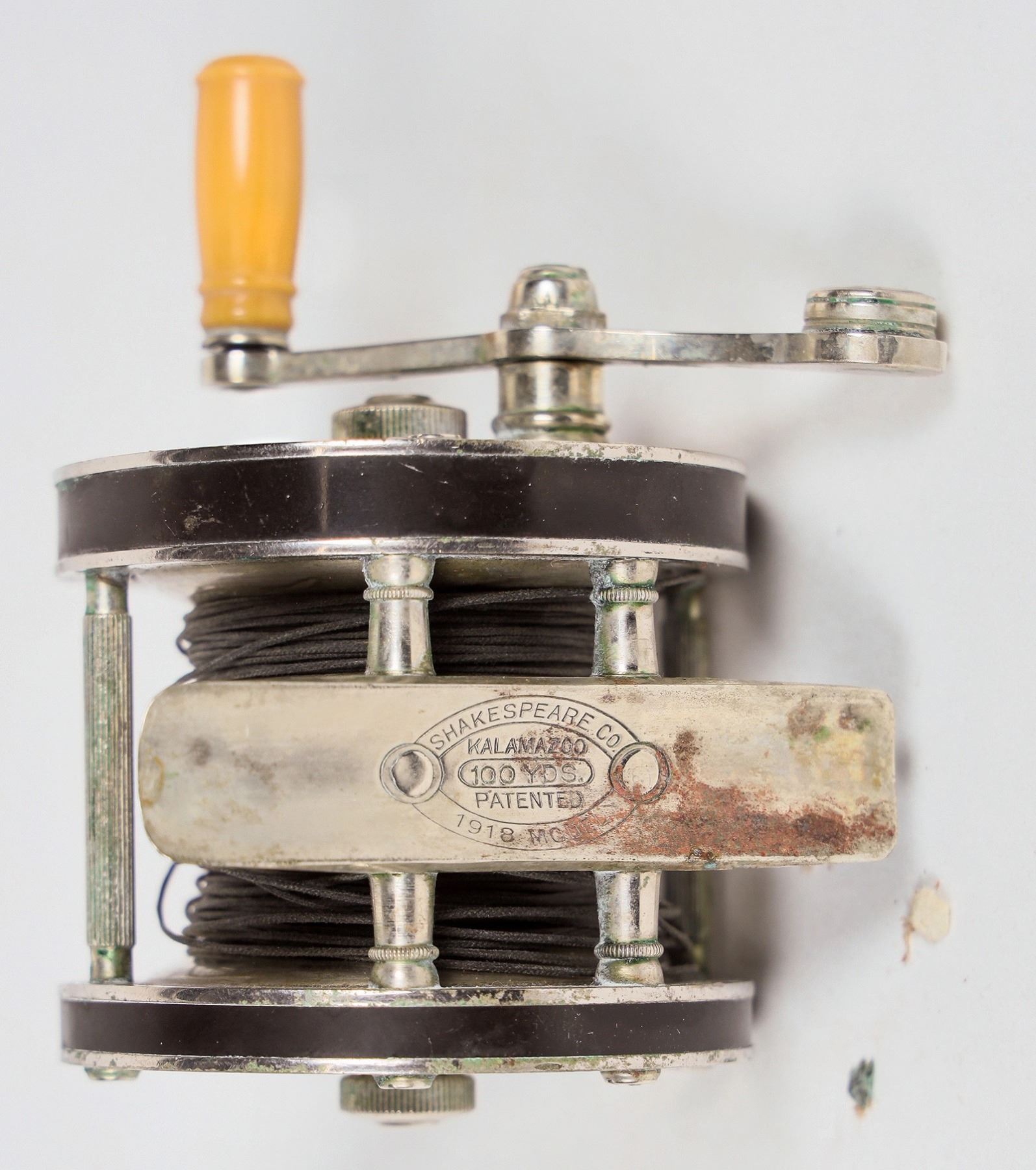 Shakespeare Casting reel node 1918 w/leather case, Reel appears in good condition with casting line approx.. 100 yards. There is no rust and appears to have very little use. It operates smoothly. Case and reel are in excellent cond.