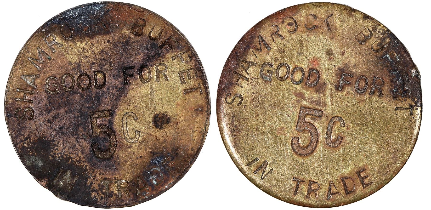 Unlisted token from Creek County: Shamrock Buffet / Good For / 5c / In Trade. Reverse the same, all incuse. Br., rd., 21 mm.
