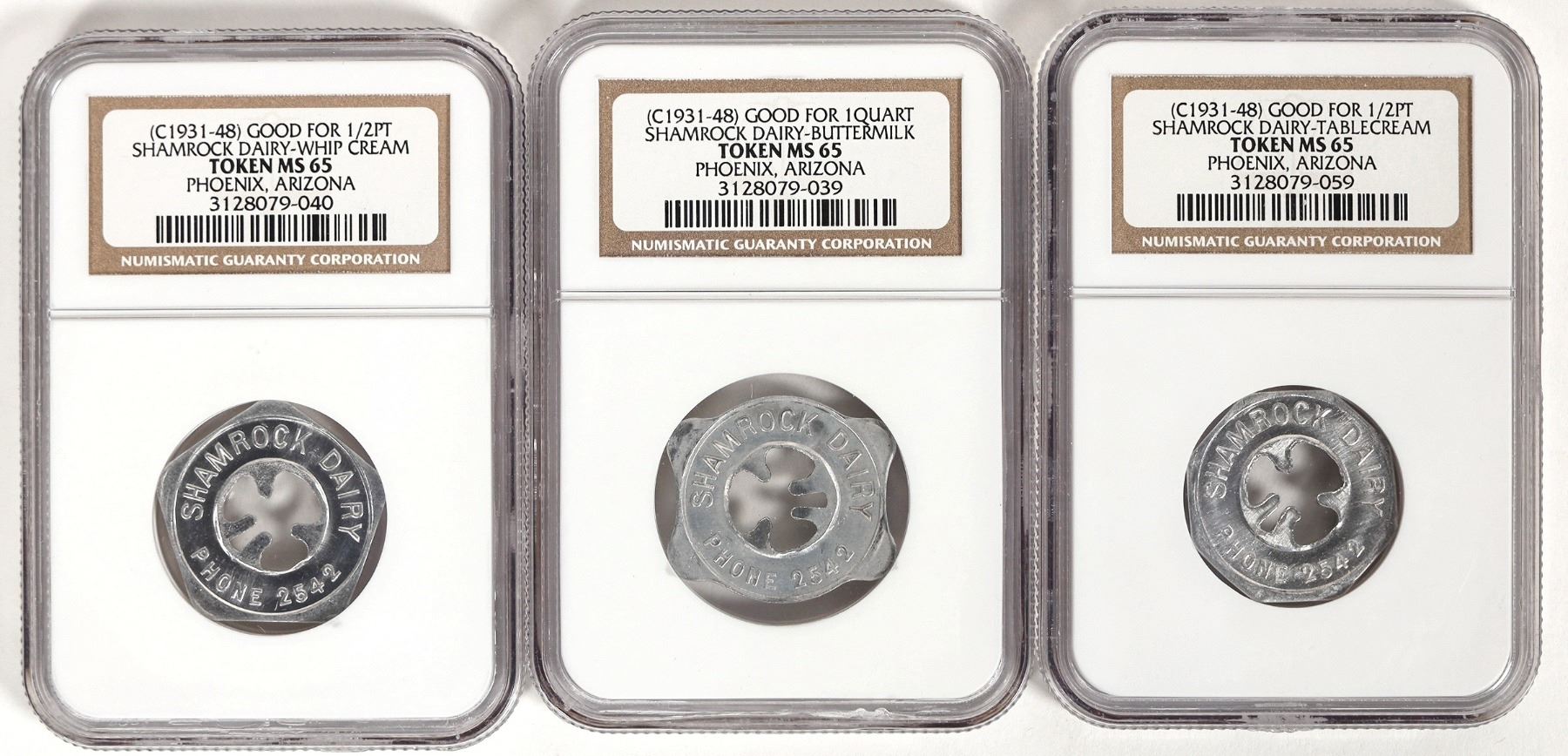Three different tokens from Shamrock Dairy, all NGC graded MS 65 with clover leaf cut outs. Good for: buttermilk; whip cream; and table cream.