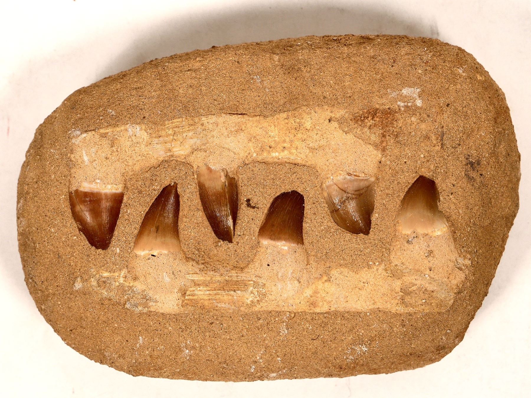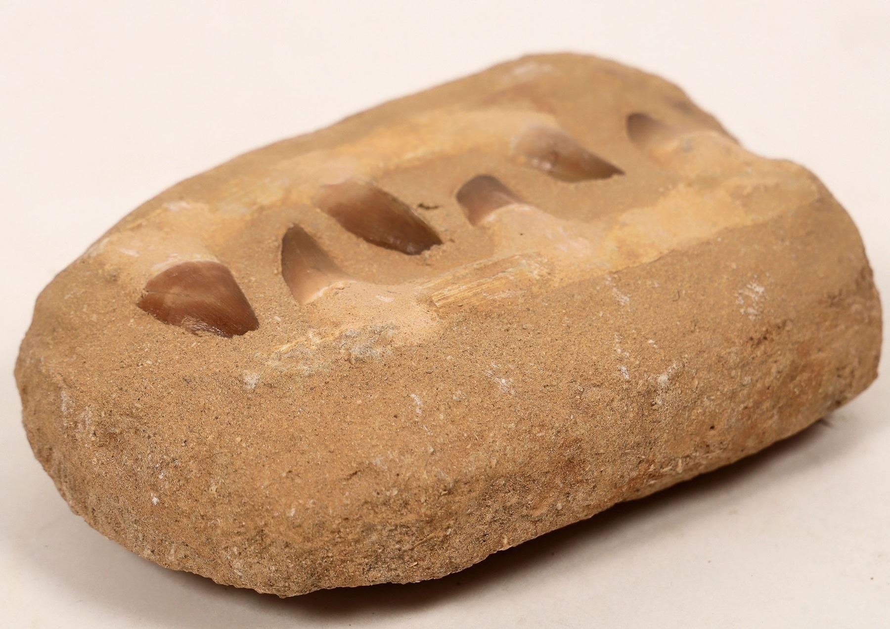 2 partial fossil shark jaws in stone with 6 teeth. 4x6".