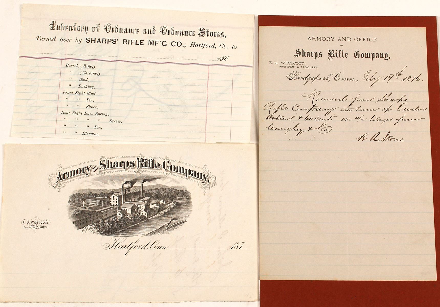 All different. 1) 1876 letter from RR Stone about receiving $12.60. 2) 186- unused pre-printed inventory sheets for items the Sharps' Rifle Company sold. 3) Pictorial 187- Armory of the Sharps Rifle Company. 1874 note on back that John Galloons & Sons (?) received by mail 6 sharps rifle with lever springs.(Potter Collection) Date: c1876 Location: Bridgeport, Connecticut HWAC# 58372