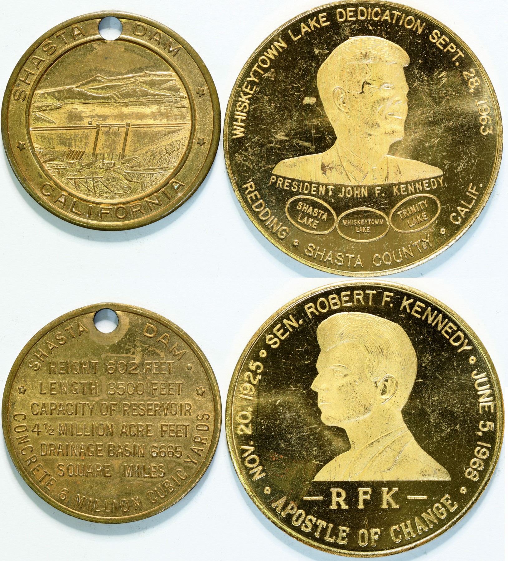 Lot of two: Shasta Dam medal (holed), 30 mm, pictorial obverse, dam statistics reverse. Whiskeytown Lake Dedication medal 1963, JFK obverse, RFK reverse, 38 mm.