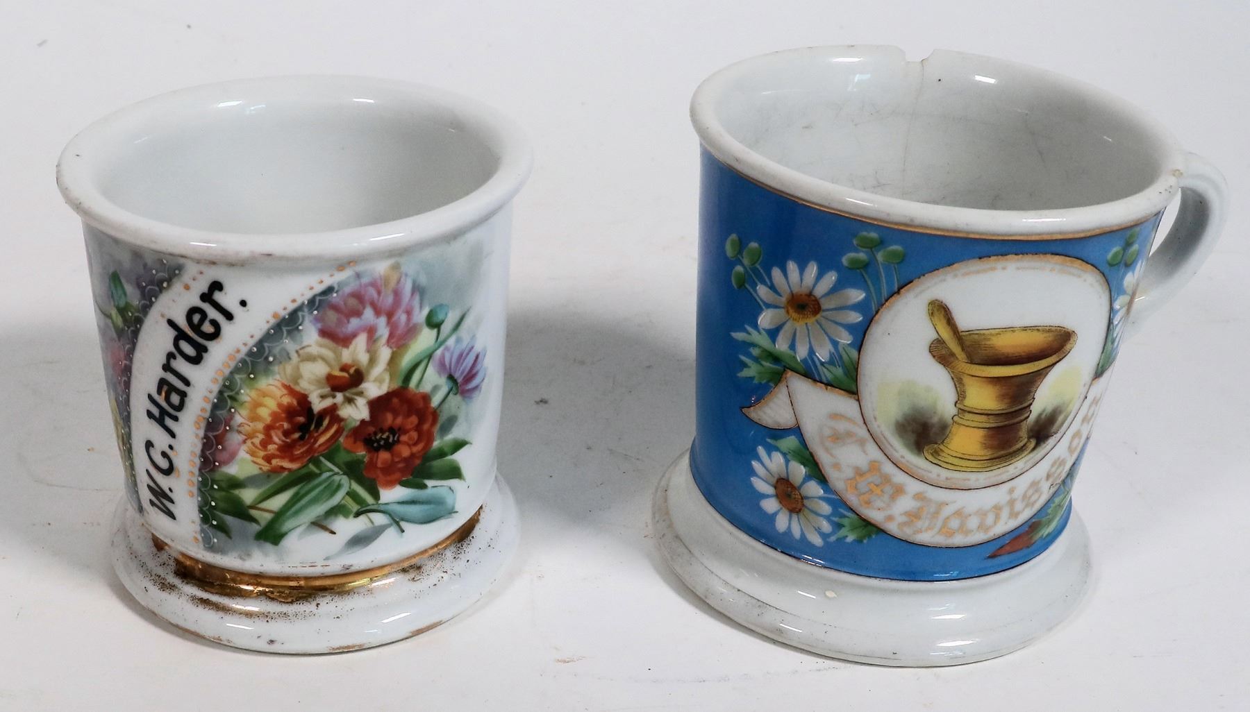 A pair of hand painted shaving mugs bearing the owner's names. A) E. W. Davisson, a cattleman in West Virginia c 1900. Two big chips. Apothecary emblem. B)W. C. Harder. A newspaperman that worked for the Minneapolis Star Tribune. Floral emblem. c. 1900s