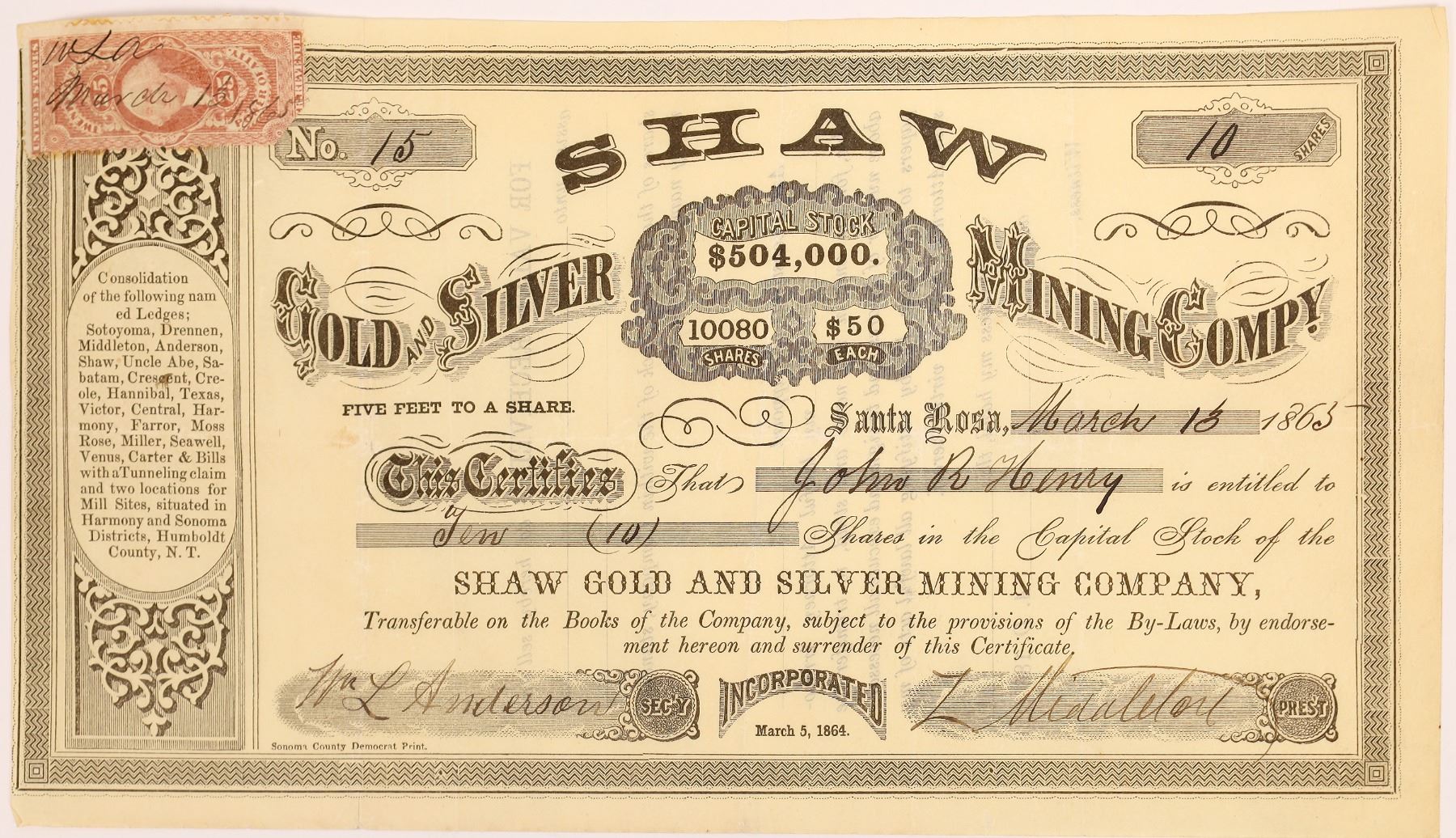 This company is listed as being in the Harmony & Sonoma Mining Districts in Humboldt County. Number 15 for 10 shares to John B Henry. Datelined Santa Rosa 1865. Incorporated in the Nevada Territory on March 5, 1864, Signed by secretary William L Anderson and president Z Middleton. The stock lists twenty ledges, one tunneling claim and notes two locations for mill sites. This is a great stock just to collect these historic ledges. Printed by the Sonoma County Democrat. 25c Power of Att'y stamp upper left (with ripped corner). Heavy folds. Dog ears. Original trustees were FA Shaw, Z Middleton, L Carter, TJ Drennon and WL Anderson. Notes on Anderson, Middleton (Sonoma JofP - and this is in the Sonoma MD? Interesting!) and the mining district.