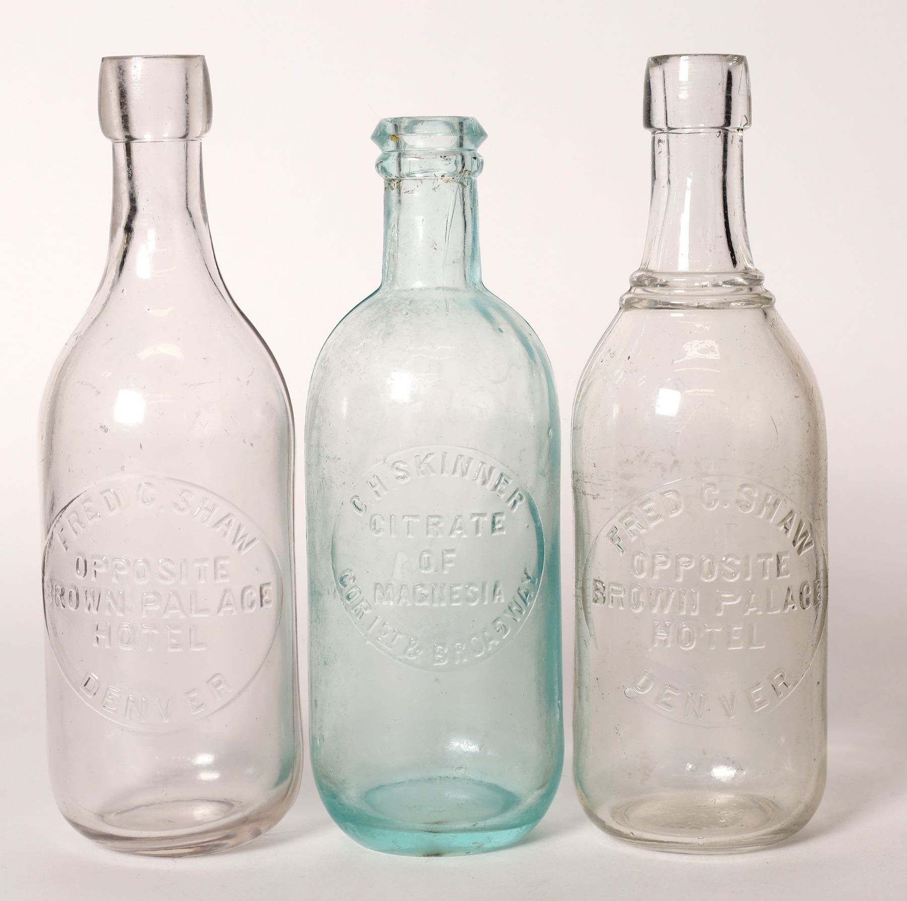 2 different clear Fred C Shaw/Opposite Brown Palace Hotel/Denver 8". Aqua C H Skinner/Citrate Of Magnesia/Cor. 1st & Broadway-small base bruise. 7.5". No apparent chips or cracks. Reed Collection.