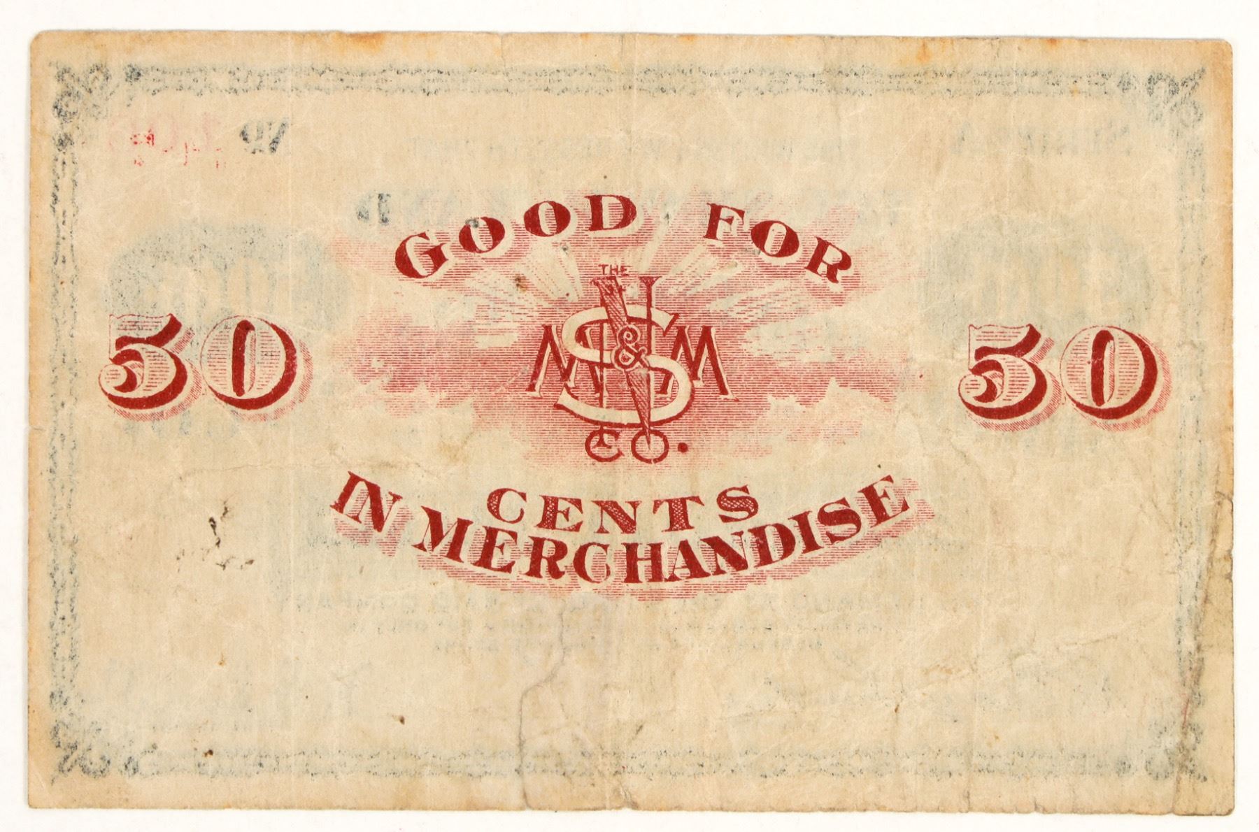Extremely rare. Shawmut & Nevada Mining & Milling Co., Fay, Nevada, 50 Cents, c.1904. This note is signed by G. Pray Smith, president of the mining company, and R. G. Smith, manager of the company store. Fay is now a ghost town some 25 miles northeast of Pioche. 2.5 x 4"
