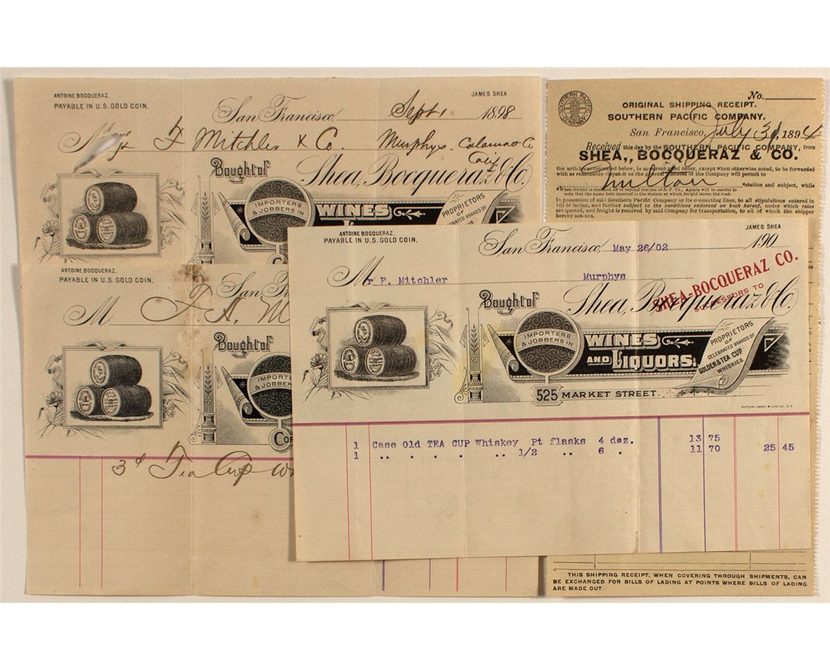 Three similar billheads. Two are for TEA CUP WHISKEY to Frank Mitchler in Murphys. One is for Golden Bourbon.City: San FranciscoCounty: San FranciscoState: CADate: