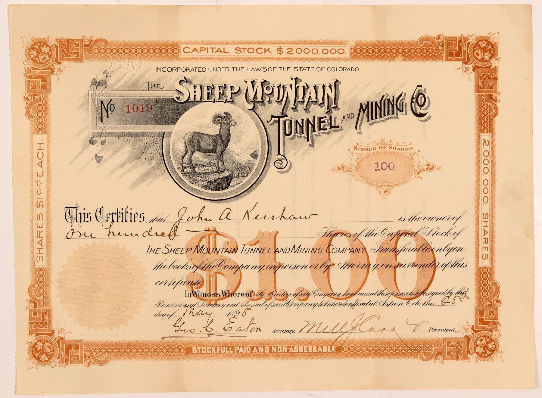 Inc. in Colorado. No. 1019, issued for 100 shares to John A. Kershaw on May 25th, 1895 in Aspen. Signed by vice-president Mill J. Carr and secretary George Eaton. Not cancelled. Brown border, black print, and vignette of big-horn sheep. Pinholes, folds, some toning. 8.25 x 11" This company operated at Crystal (now a ghost-town) in Gunnison County and built the Crystal Mill in 1893 to supply power to the mines in the area. Water from the Crystal River was dammed and used to provide electricity for air drills and ventilation for miners. The powerhouse at the mill used the flow of the Crystal River to power an air compressor, and the compressed air was piped to the mines to run pneumatic drills. The mine shut down in 1917. Ken Prag Collection