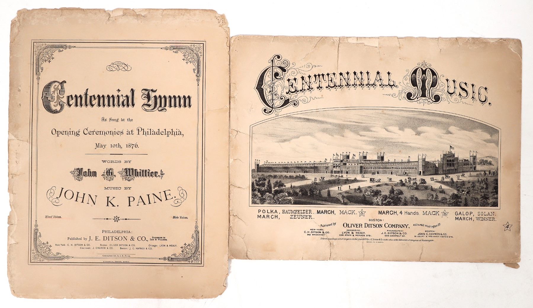 Sheet music from the Centennial International Exhibition of 1876 in Philadelphia (2). Includes 14" x 11", 5-page, Beacon Lith. Co. Boston lithographed sheet music titled "Centennial Music," which features music for the Grand Centennial March by E. Mack and "Dance Music for the Piano-Forte," with riffs (polkas, marches, galop) titled Fire Bells, Fairy Queen, Harvest Time, Mountain Breezes, etc. And a 10.5" x 14", 3-page, pub. by J.E. Ditson & Co., titled "Centennial Hymn, as sung at the Opening Ceremonies at Philadelphia, May 10th, 1876," words by John G. Whittier, music by John K. Paine, copyrighted 1876. Age worn, but highly collectible. See photo(s) for condition.