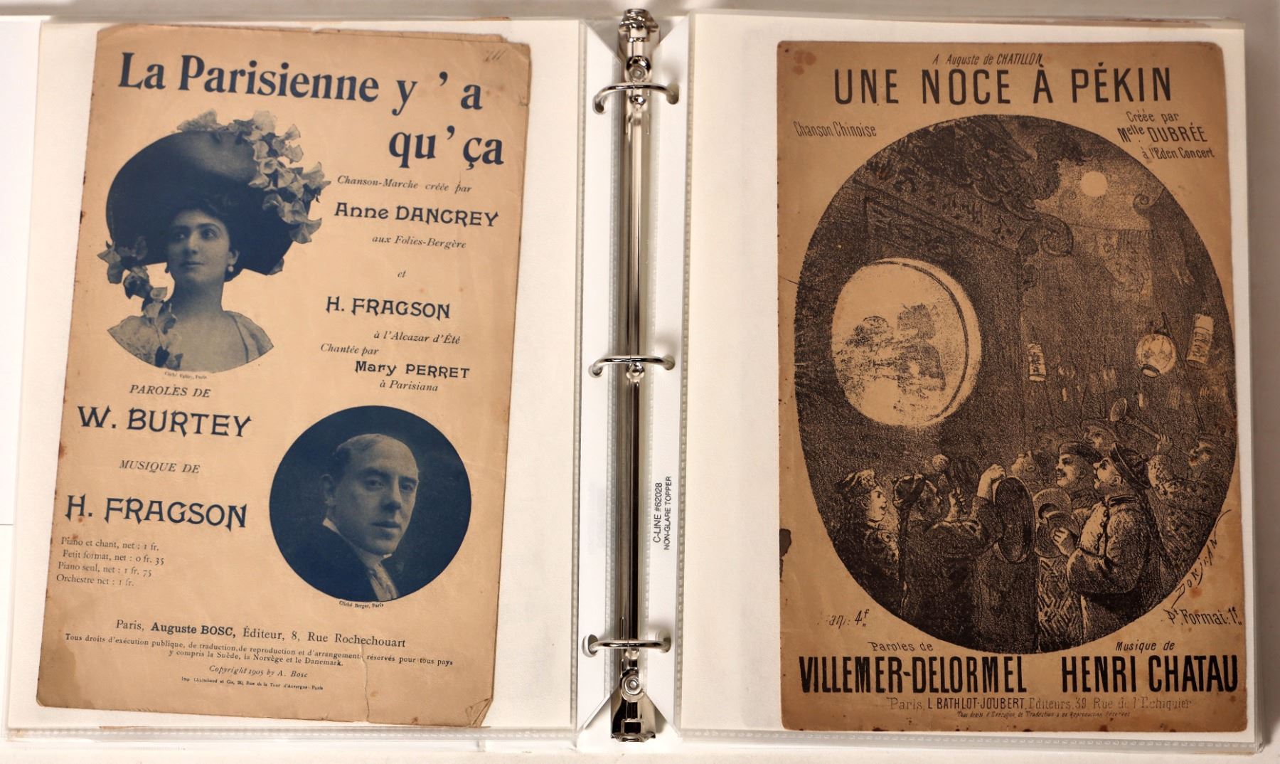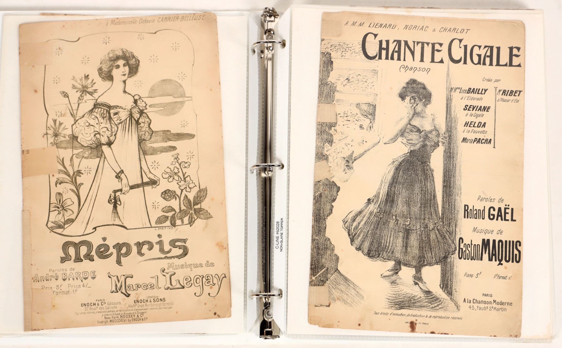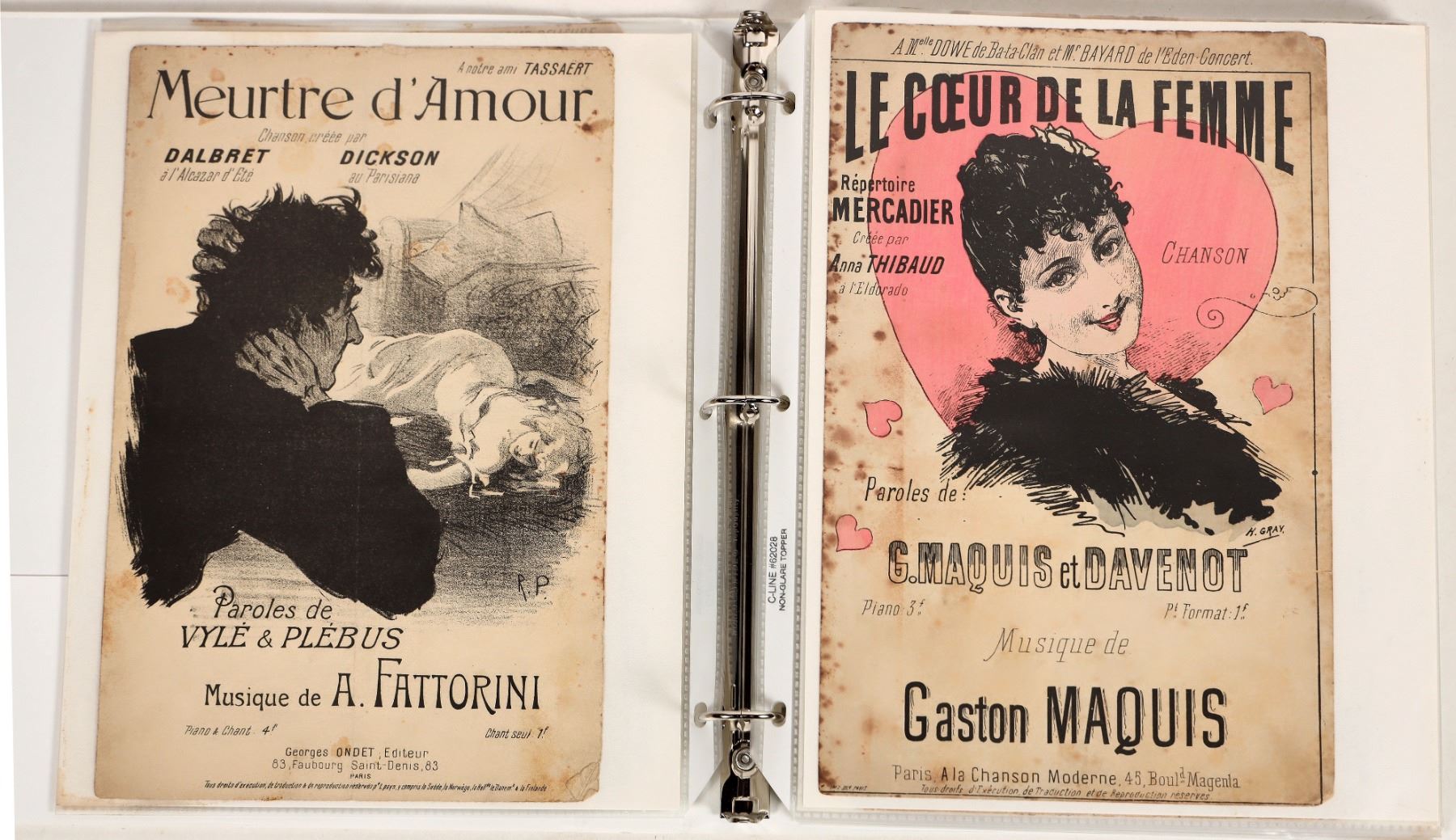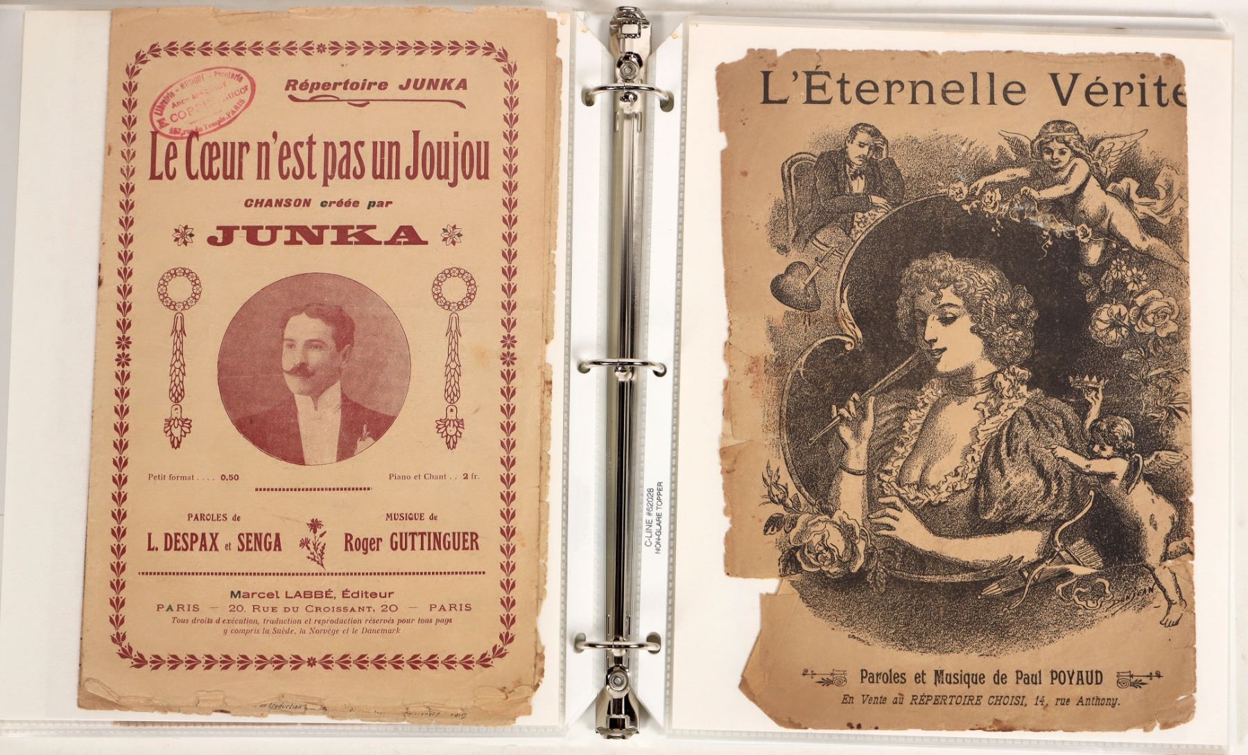 A collection of 48 different pieces of sheet music from France, c1890s-early 1900s. Each approximately 7" x 11" folded. Colorful and artistic covers.