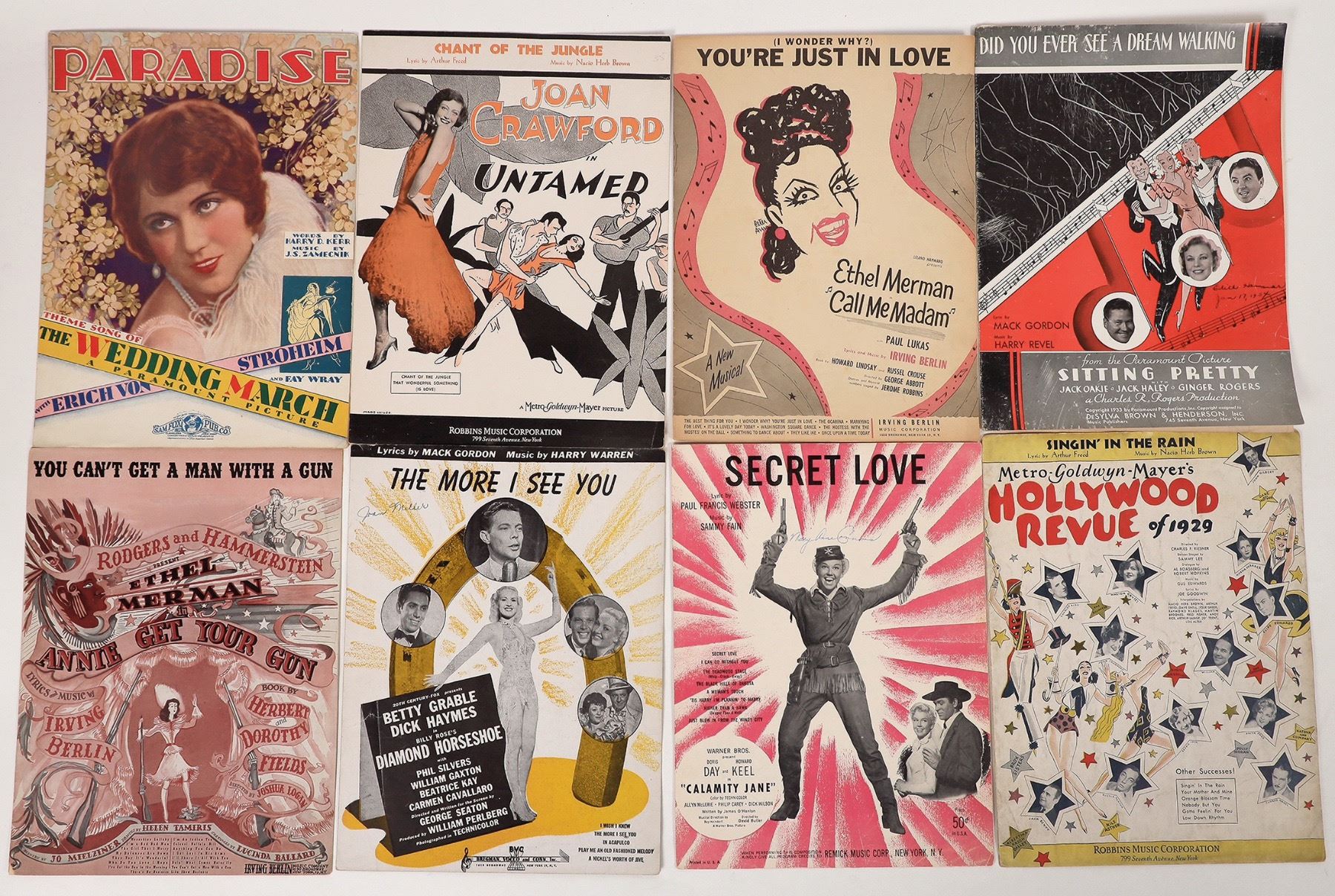 Sheet music from four decades of Hollywood films. Songs include "Singin' in the Rain" (1929), "Secret Love" (1953), "You Can't Get a Man With a Gun" (1946) and more. All are complete and in decent condition. Please see photos for more details.