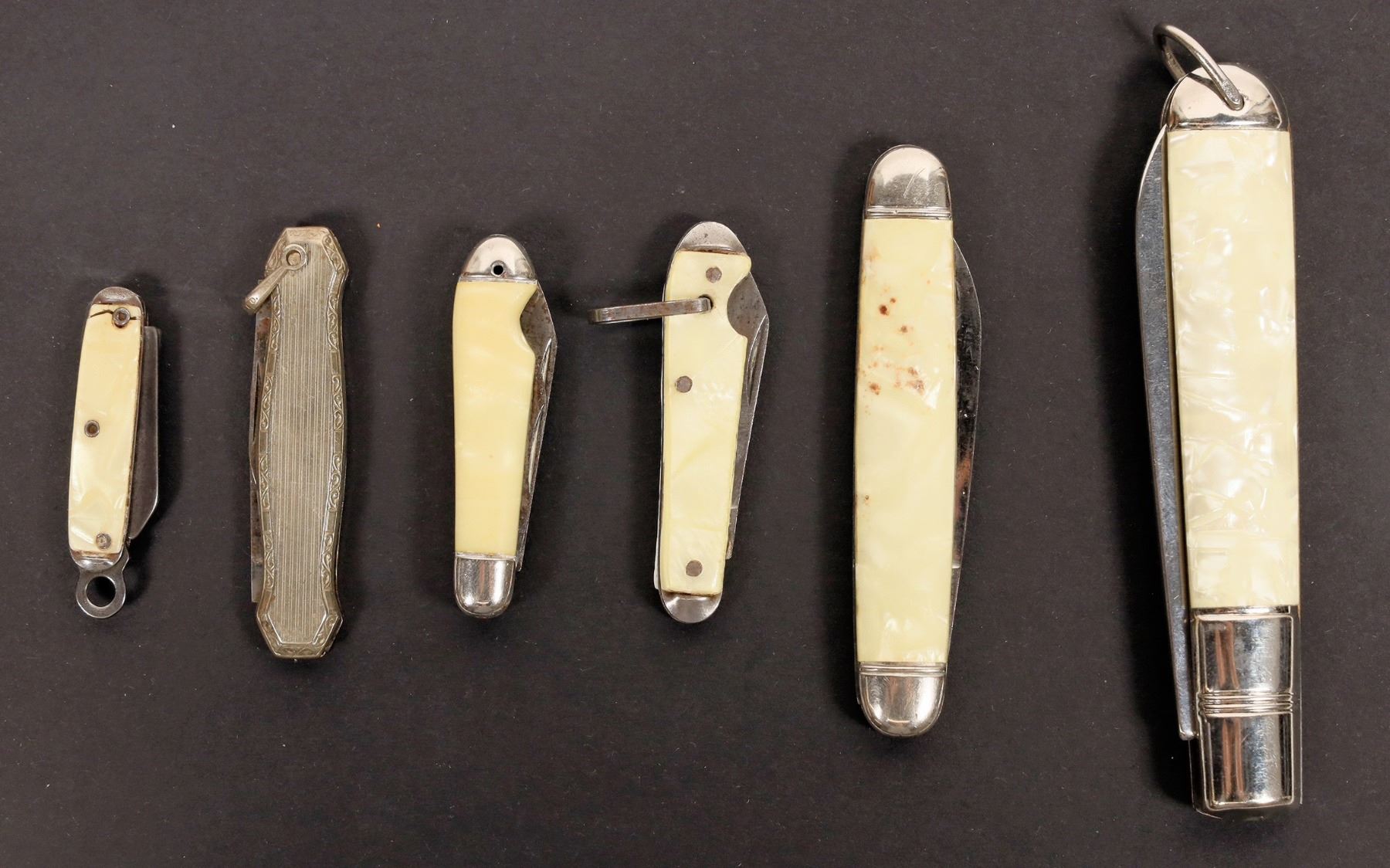 This lot holds six Sheffield folding knives. Five carry white mother of pearl scales; one has silver tone metal scales. All are from 1.75 in. folded to 3.25 in. folded. Condition is like new to used.