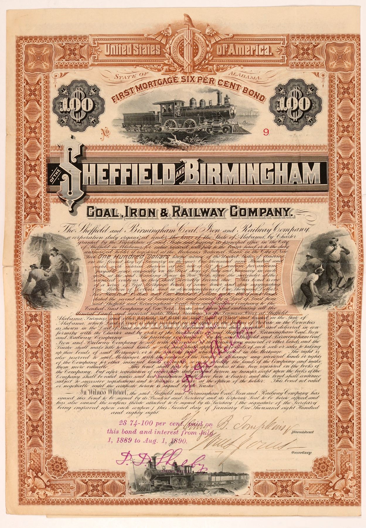 The Sheffield and Birmingham Coal, Iron and Railway Company started operations in 1887 and stopped service in 1889 for a total period of operations of 2 years. This is a gorgeous certificate w/ four vignettes: bottom 4-4-0 w/ coal cars r-l. left/right center coal miners. Top 4-4-0 w/no cars l-r. #9, I/C, $100, 6% 20 yr. First Mortgage bond. Issued Jan 2, 1888. Signed B. Tomplemis V.P. BROWN, embossed seal, SIX PER CENT white lettering in brown underprint box. Coupons 3-40 attached. Franklin Bank Note Co. VF Ken Prag Collection