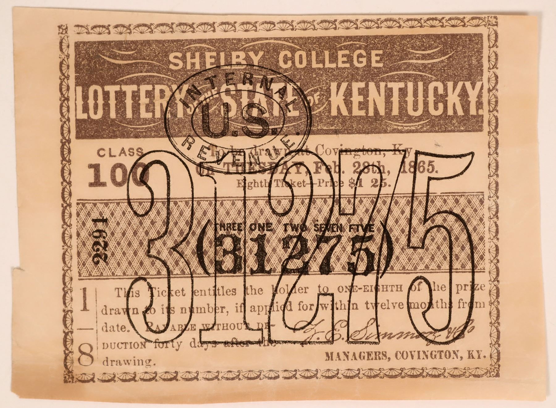 Priced at $1.25 issued Tuesday, Feb. 28th, 1865. The lucky number was 31275. 4 x 3 inches.