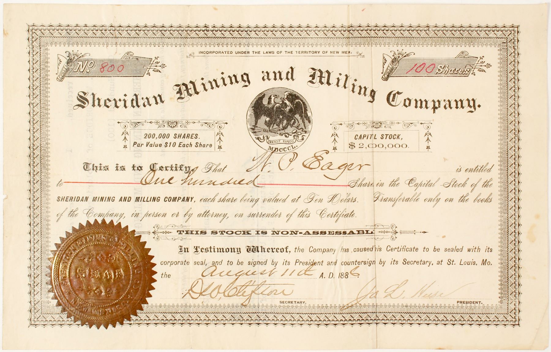Inc. under the laws of the territory of New Mexico. No. 800, issued for 100 shares to NP Eager on Aug. 11th, 1886 in St. Louis, MO. Signed by the president (Huse?) and secretary Clifton. Not cancelled. Gold seal and vignette of New Mexico seal. Stains, and unusual folds and creases. A Feb. 15, 1887 St. Louis Post-Dispatch article describes a reorganization of the company that held property near Silver City, NM including the Four Hawks claim. The 1905 Report of the Secretary of the Territory and Legislative Manual for New Mexico lists its principal place of business as Cooney, which is a ghost town that was washed away by flooding in 1911. State: New Mexico City: Cooney Al Adams Collection. HWAC# 59082