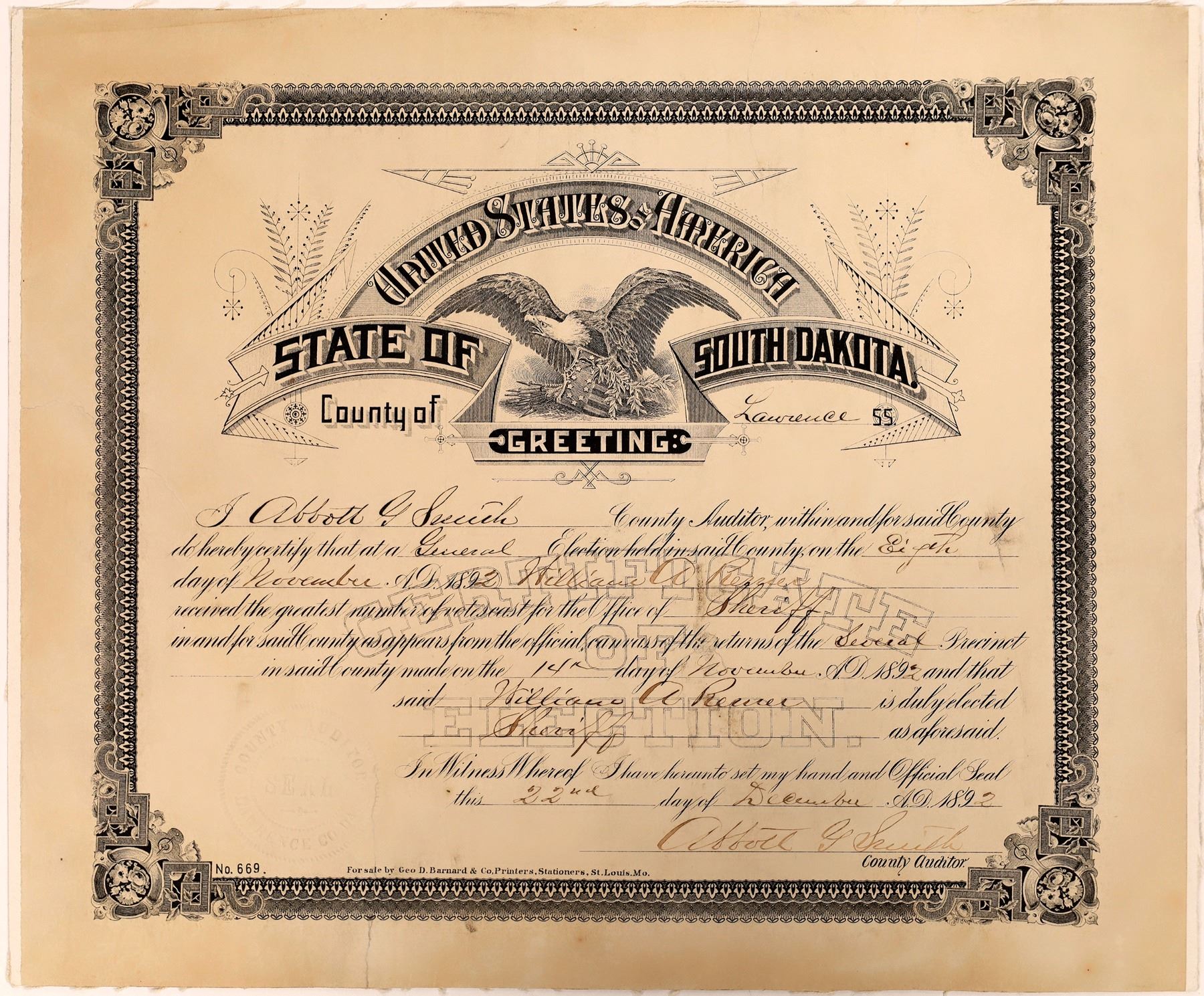William A. Remer was elected Sheriff in 1892 and again in 1894 in Lawrence County, SD. Deadwood was the big town, hosting the famous Homestake mine. This appointment certifictae is signed by the County Auditor, 12/22/1892. Mounted on cloth. Nothing found in newspapers.com on Remer. He was Sheriff during the depressive 1890s, where silver prices had dropped precipitously, and mining in general was in a terrible slump. But in 1892, the Black Hills gold mines, and those of Colorado increased production over the previous year, defying the national trend. In 1891, Dakota produced $3.5m in gold, Colorado $4.6m, and California led all with $27.3m in gold production. (Rothwell, Mineral Industry, 1893)