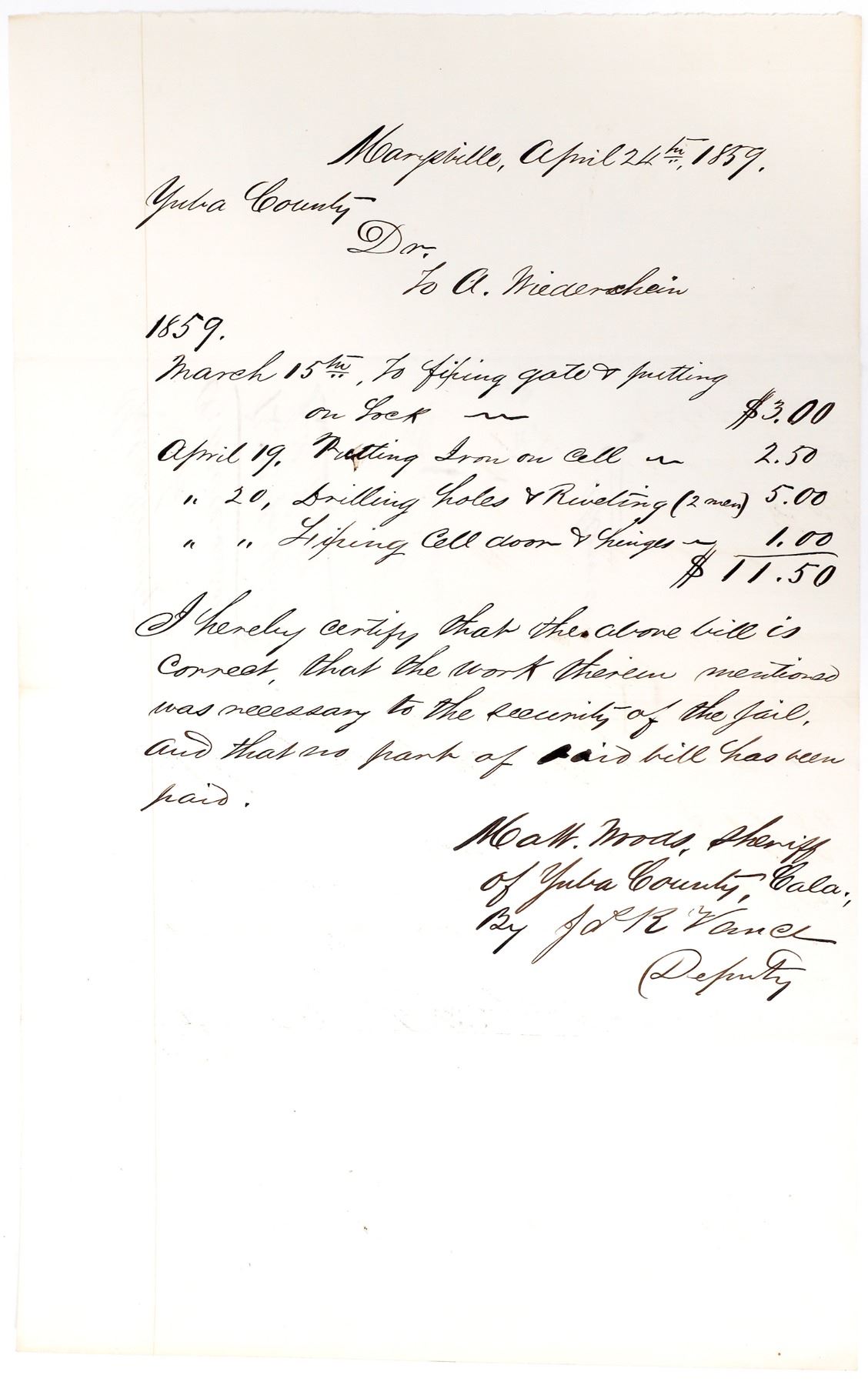 Addressed to A. Wiederchein for fixing gate and putting on a lock, putting iron on cell, drilling holes, riveting and fixing cell door and hinges. Total $11.50. Signed by Deputy Sheriff Vance for Sheriff Matt Woods. Marysville California