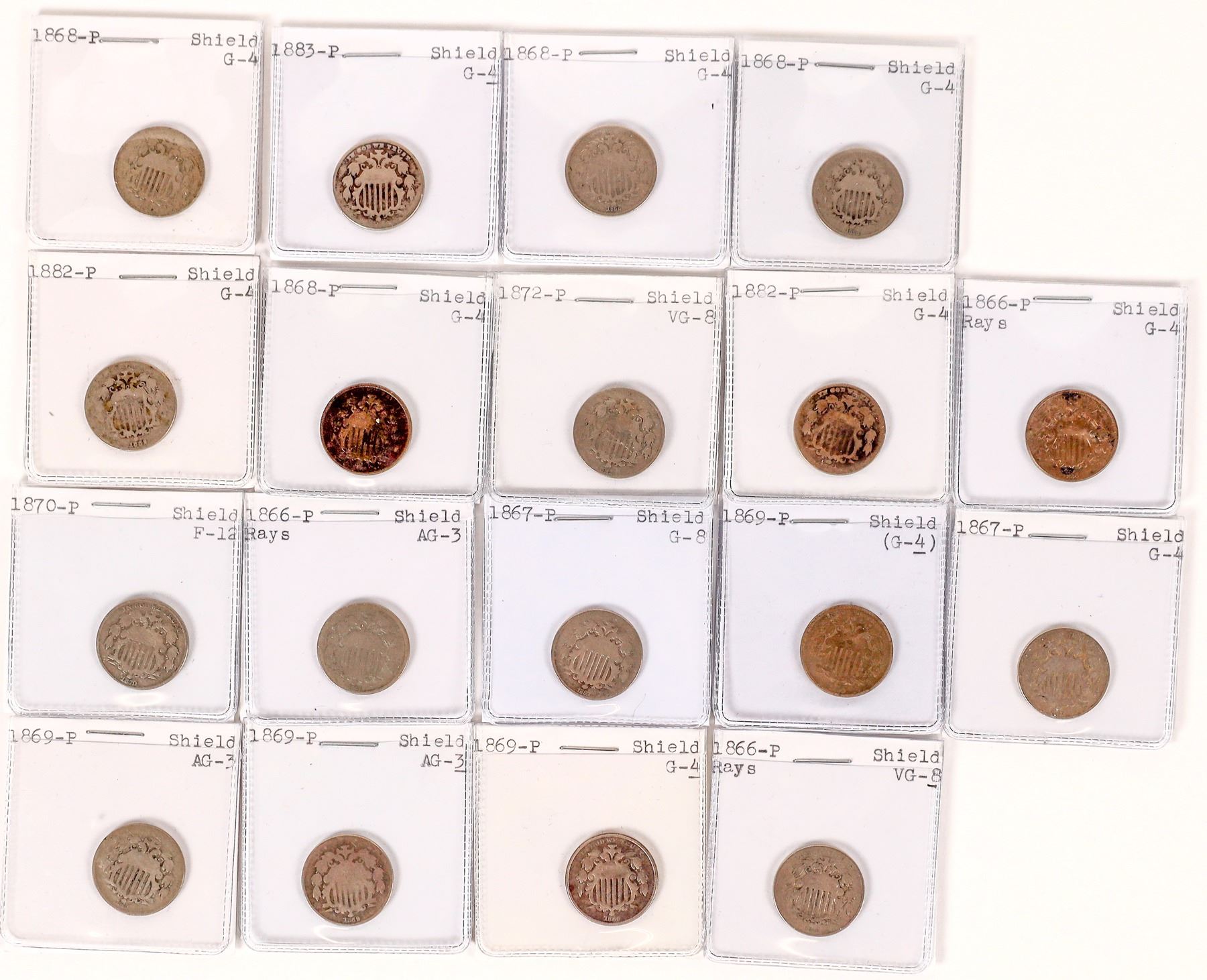 Dealer lot of 18 Shield NIckels in 2 x 2s, dated and graded for your inventory: 1866 rays (3) AG-VG; 1867 (2) G; 1868 (4) G; 1869 (4) AG-G; 1870 F; 1872 VG; 1882 (2) G; 1883 G.