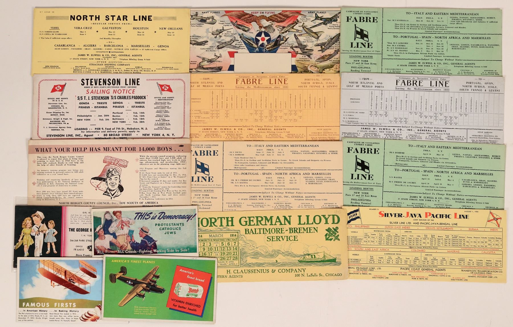 NIce grouping of military subject matter blotters. Includes a neat blotter that showcases Navy & Army planes, titled "Keep 'Em Flying," with a bald eagle. Includes five blotters for the Fabre Line serving the Mediterranean since 1881. Also includes two blotters that are Bond Bread advertisements , one featuring the first airplane to carry a man to the skies at Kitty Hawk, N.C. 1903, and the other featuring a B24 Army bomber. A unique blotter shows sailors in a locker room and states, "This is Democracy! Protestants, Catholics, Jews. All races-All creeds- Fighting, Working Side by Side!"