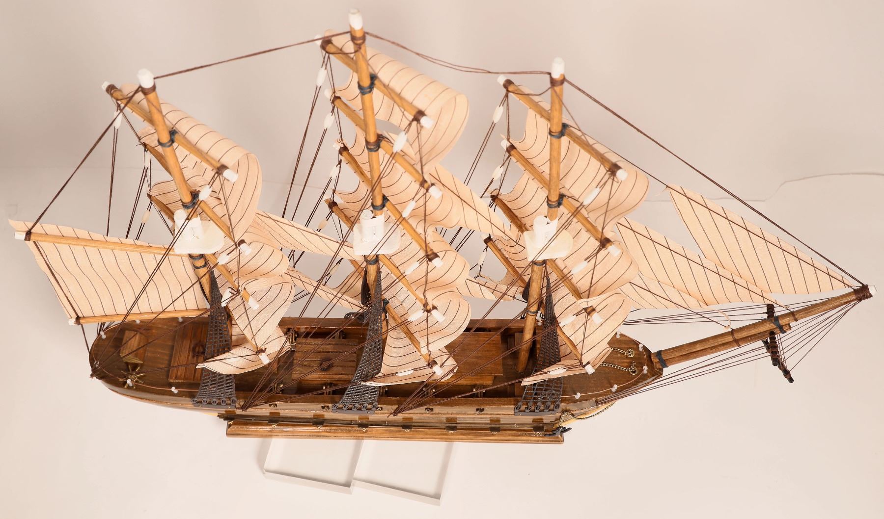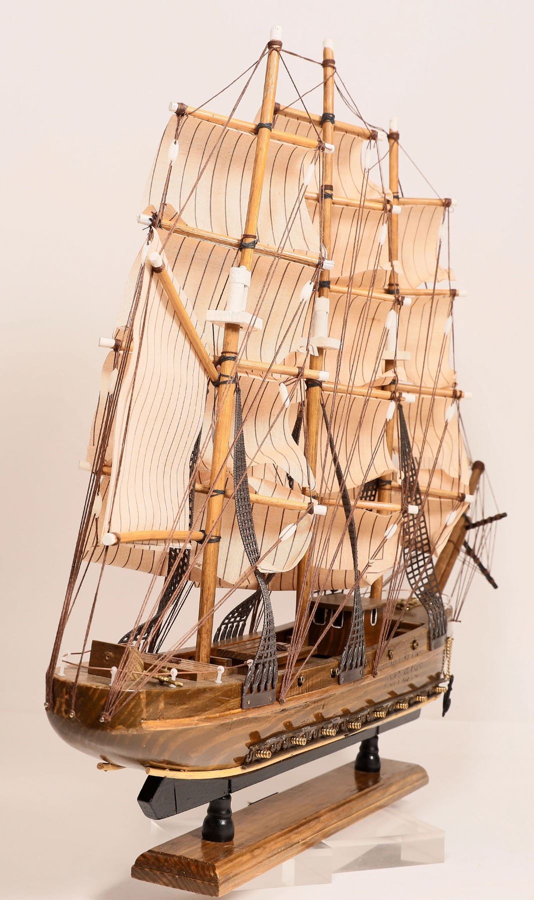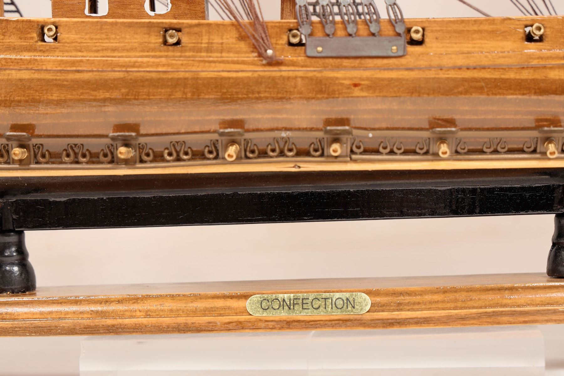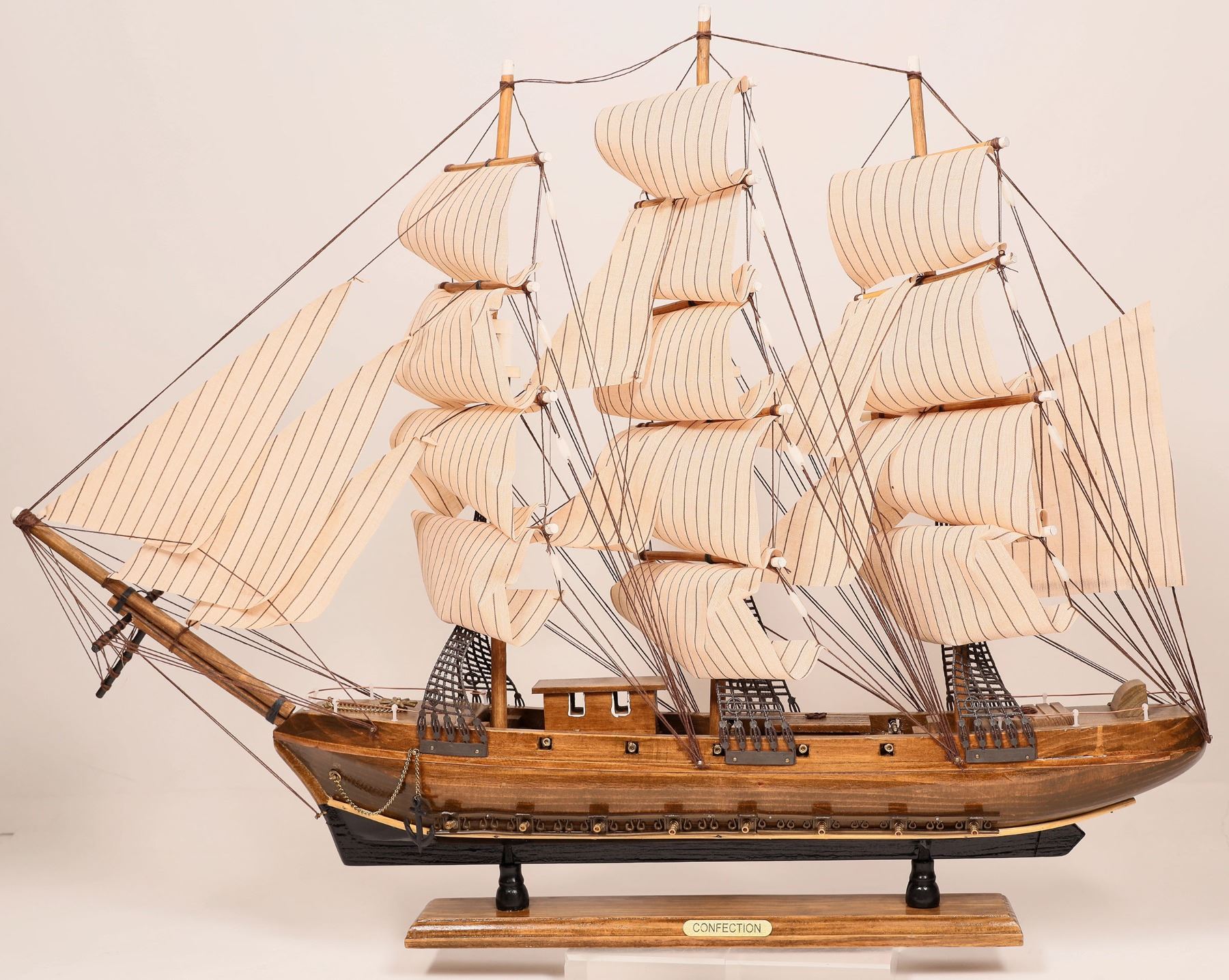 This model ship "Confection" was known as the sweet ship because she carried merchant sugar. Built in the early 1700's. Later, captured by pirates, she became known as the "sweet death" ship. It now carries 26 cannons on two decks. Handmade from a kit. Length at 30 in., height at 22 in., width at 5 in.