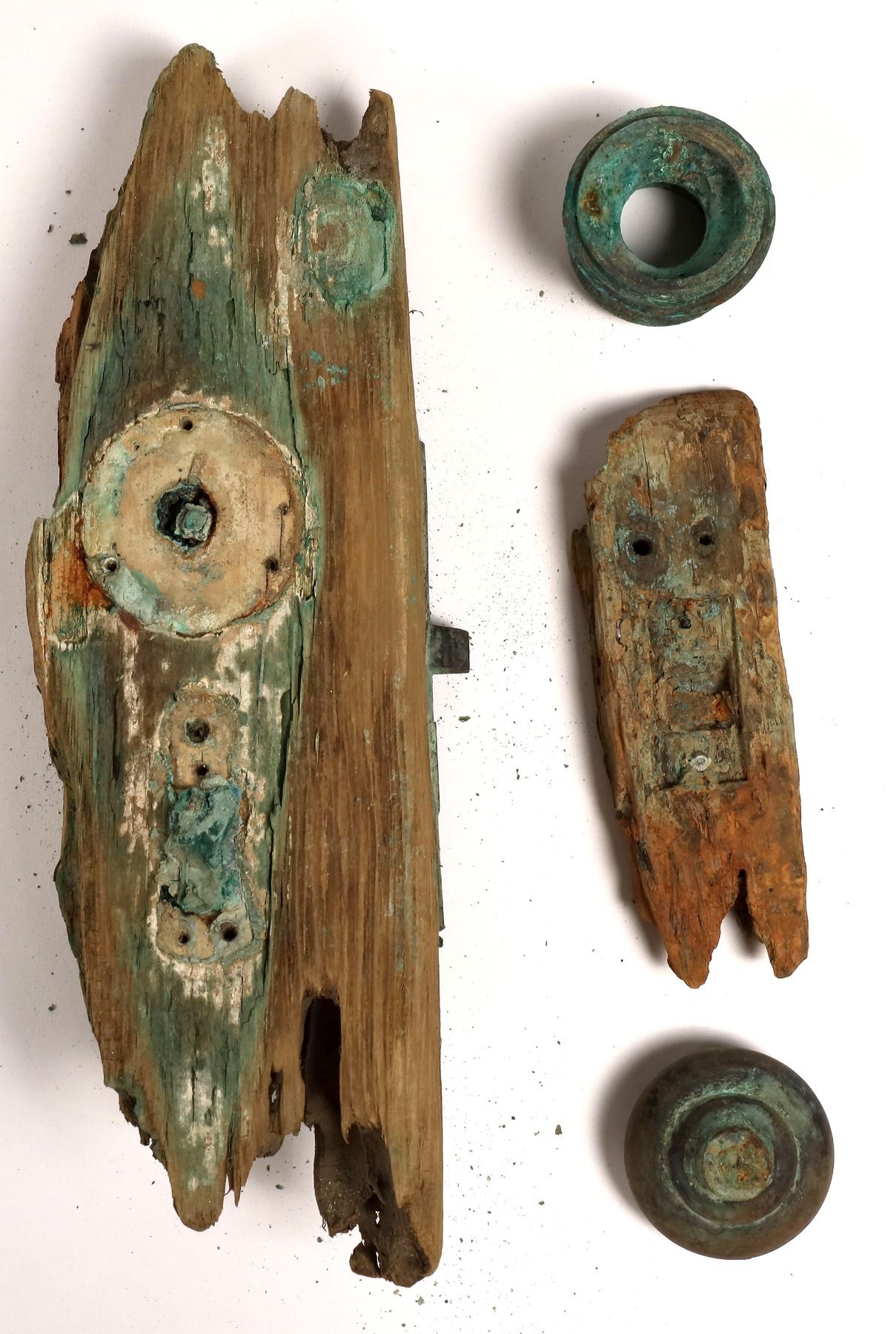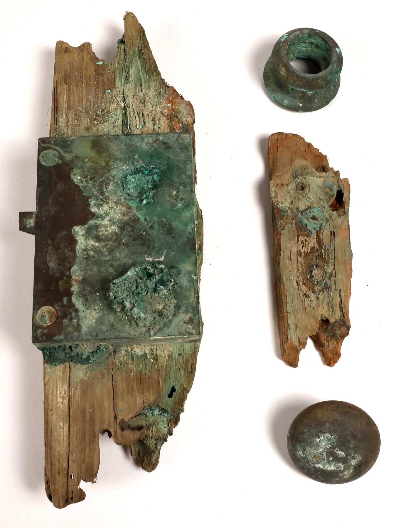 These three lots are all pieces of door off the SS Central America. We can't tell if it was an interior or exterior door. This group well illustrates an 1857 door onboard an ocean steamer. 1) Wood Door Latch Frame. Section of wood door frame which housed the metal strike plate for a door lock. Strike plate not present. 6x1.75x5/8". 5 drilled holes 5/8" apart. 2 drilled holes for strike plate attachment. The shape and green patina sort of looks like Gumby! 2) Door Knob and Lock. Round possibly solid brass door knob with missing round stem. Tapered toward stem area. About 1.25x2.5". Brass door lock mechanism, no maker visible, 5x3.5x75", plus detached section of wood door frame, 12x3.75". 4 partial attachment screws present. 3) Solid Brass Doorknob Socket. This solid brass circular object is the socket for crystal glass that would complete a doorknob. Found at a passenger's room. About 2 in. in diameter.