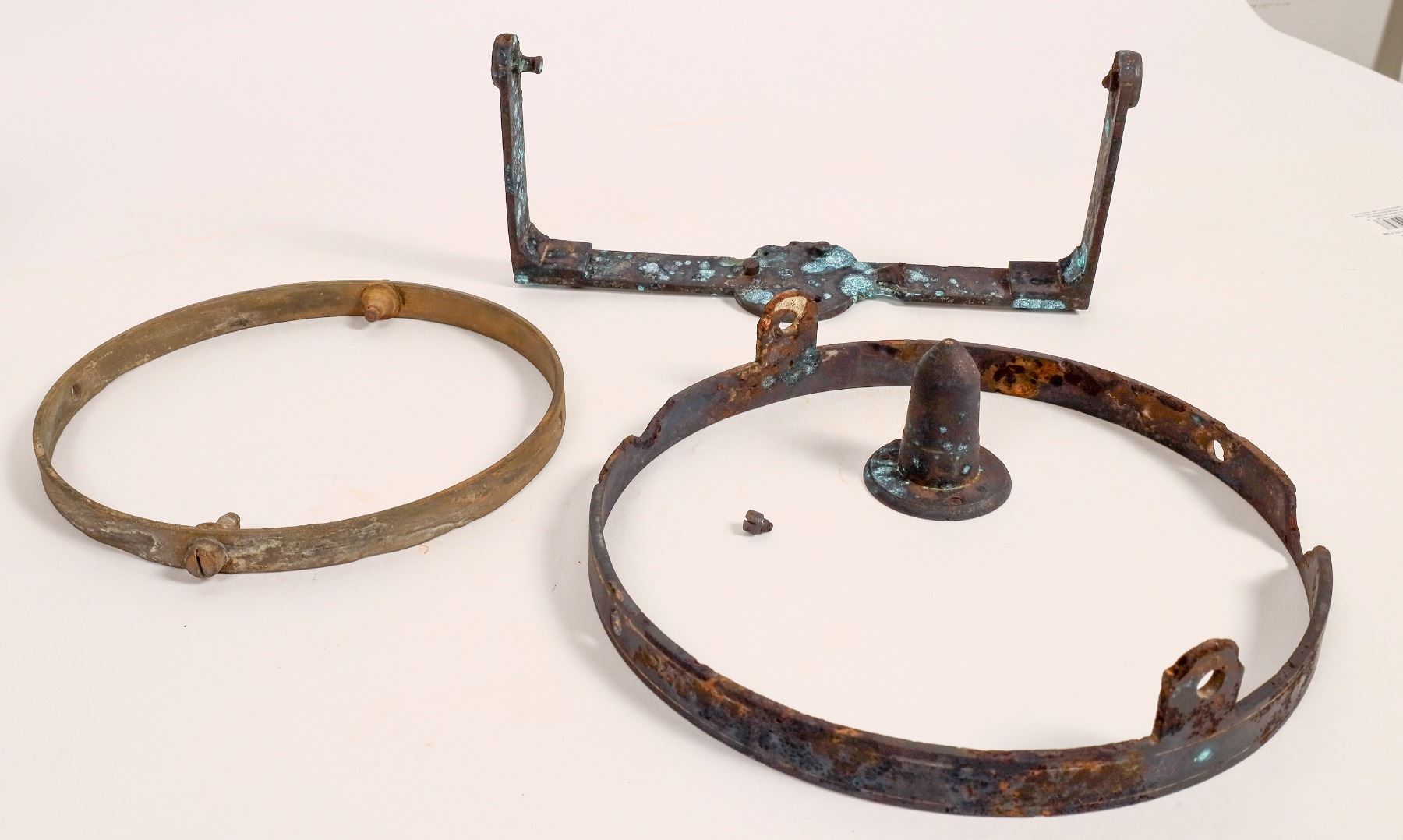 A gimbal is a pivoted support that permits rotation of an object about an axis. A set of three gimbals, one mounted on the other with orthogonal pivot axes, may be used to allow an object mounted on the innermost gimbal to remain independent of the rotation of its support. For example, on a ship, the gyroscopes, shipboard compasses, stoves, and even drink holders typically use gimbals to keep them upright with respect to the horizon despite the ship's pitching and rolling. Here we have 5 parts of the ship's gimbal. Broken screw or bolt with small amount of thread, 5/16" long. Metal ring with 2 ears, each with a 3/8 round hole, 2 indented lines around circumference 1/8 " from edges, 2x 3/8" round holes on ring, .75" and 1.5" pieces not present, light degradation. Metal bullet shape topper with flat round base, 3 partial rivets in base, 2.25x2", 5/16" chip on base, light degradation. 3 piece 10" screwed together base bracket, center 2.25" circular section, 4 bottom screws, 2 center top screws, 2x 4.5" uprights-1 with .5" pin, 1 pin missing, degradation mainly on base. Round metal 7 5/8" ring with 2 bolts and unusual tapered nuts on inside, 2x .25" side holes, small center line on circumference, some degradation.