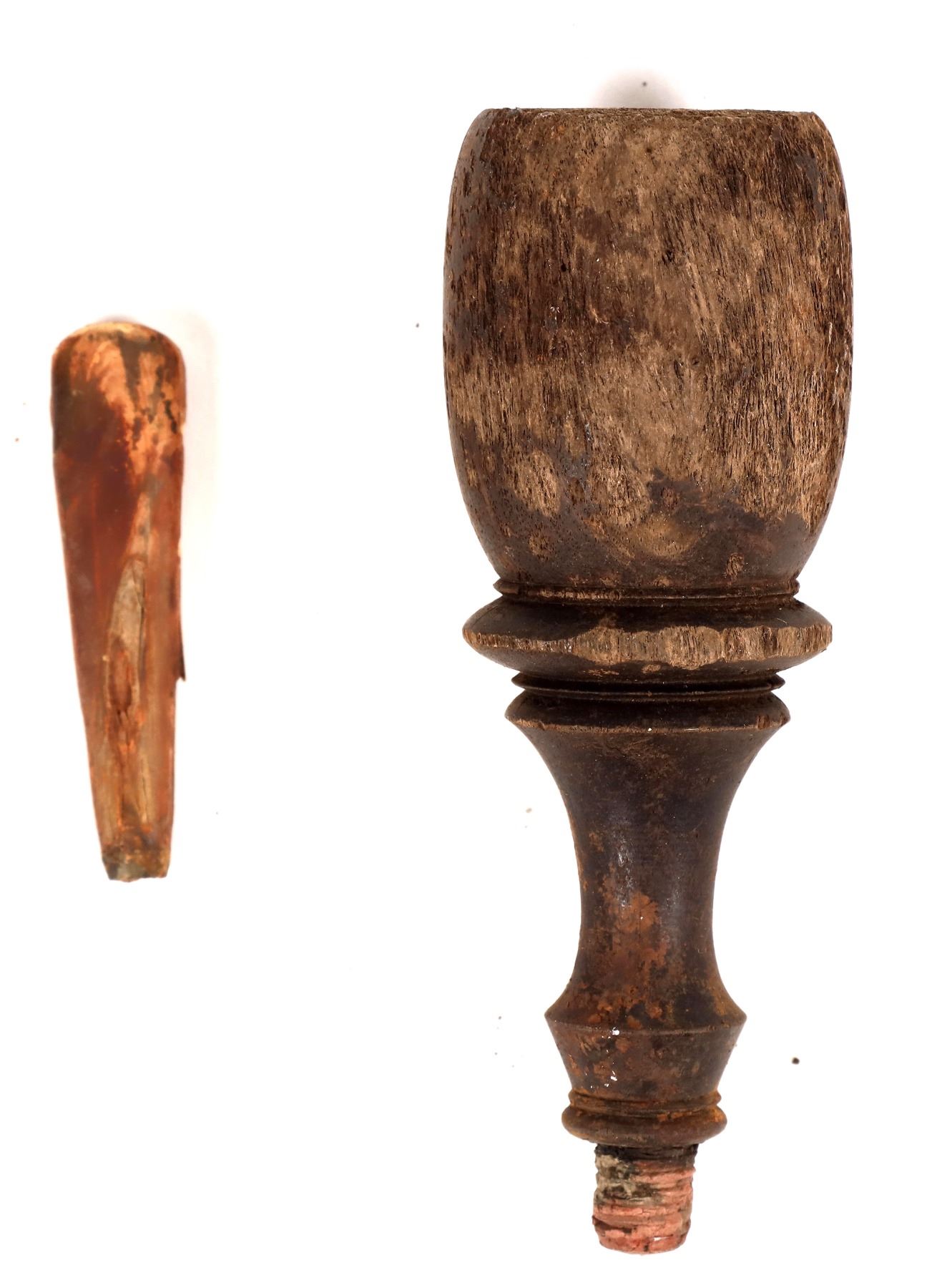 Lot of 2. 1) Ornate lathe turned wood handle. Resembles a decanter stopper in shape. Purpose unknown. 1 1/8x3.75" with .25" threaded end. 2) Small tapered wood handle. Slightly smaller end diameter on smaller end. Unknown purpose. 1 5/8 x 3/8.