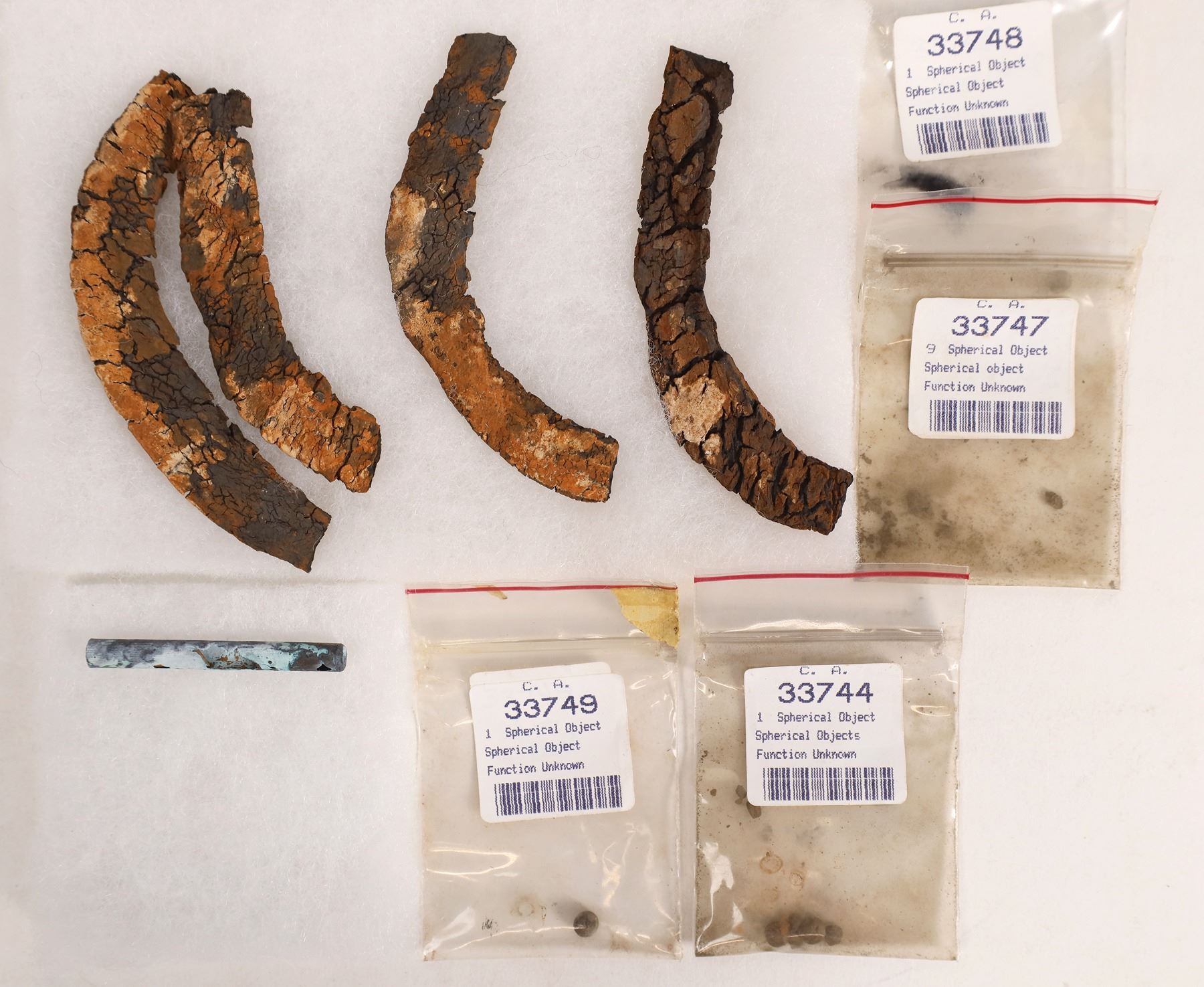 1) Steel Ball Bearings, 3, and Fragments. 3x 3/16" steel ball bearings and small ball bearing fragments. 2) Ship's Gasket Material. An oval piece of the ship's gasket material, exact purpose unknown. Made of either metal or rubber. In 4 sections that together form the gasket oval. Oval measures 8x5". Some degradation. 3) Brass tubing part. This brass part is a tube enclosed at one end. 3/16 in. diameter by 2 1/4 in. long. A steam ship vessel would have had many brass tubing components or spare parts.
