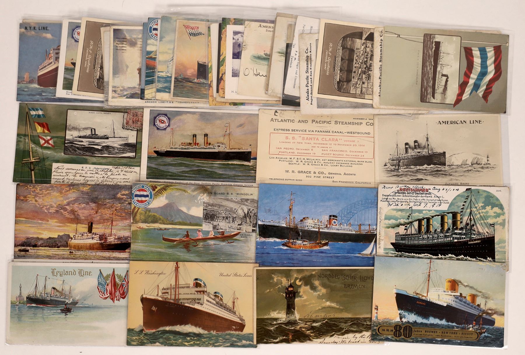 A great collection of 35 advertising postcards for various shipping lines. Cards includeThe United State Lines. Cunard Lines, Anchor Line, The Belfast Steamship Company, Leyland Line and more. Some of the cards are blank, others are used. Please see photos for more detail and condition. Date: 1900's Country (if not USA): State: California City: San Francisco Provenance: