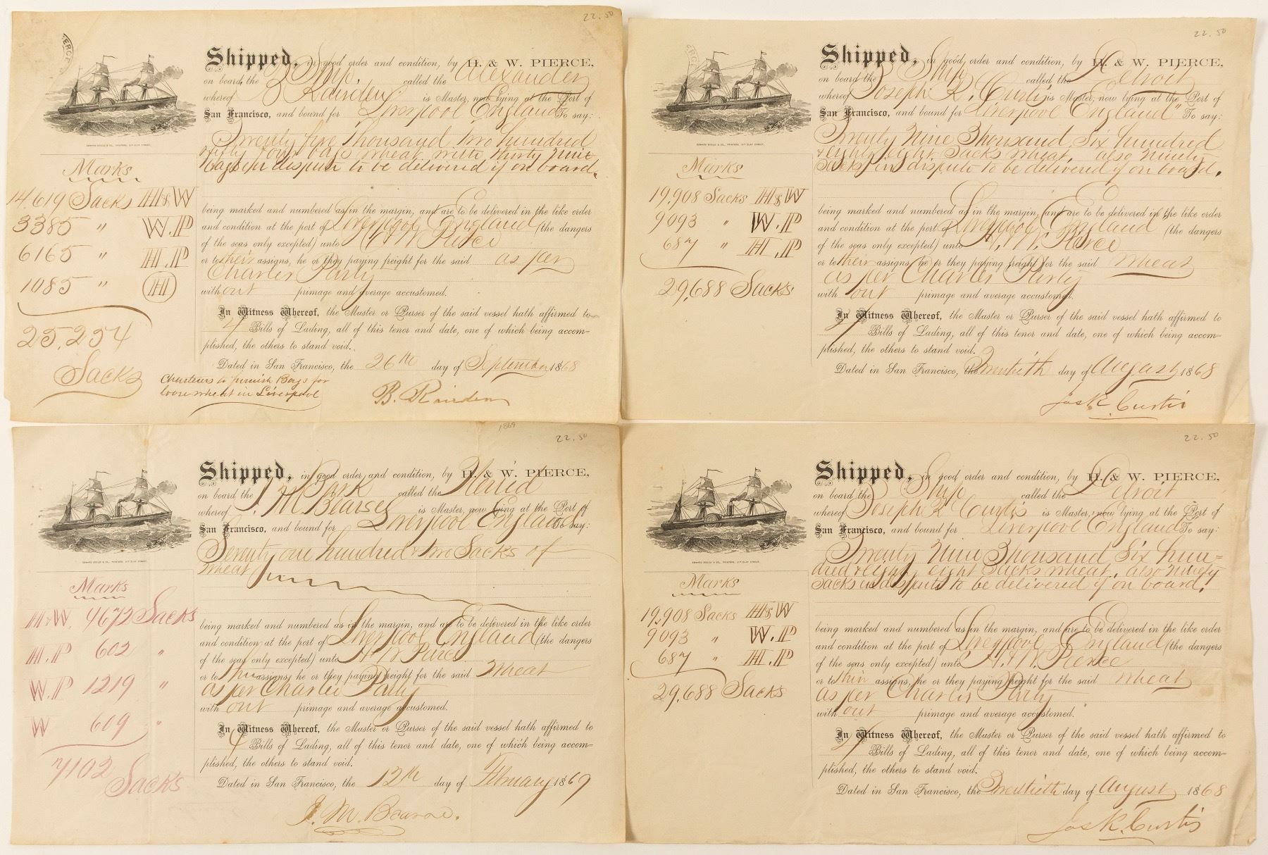 4 shipping receipts from H. &W. Pierce to Liverpool, England on the steamships Alexander, Detroit and Heried for wheat shipments. Date: 1868-1869 City: San Francisco State: California HWAC# 58660