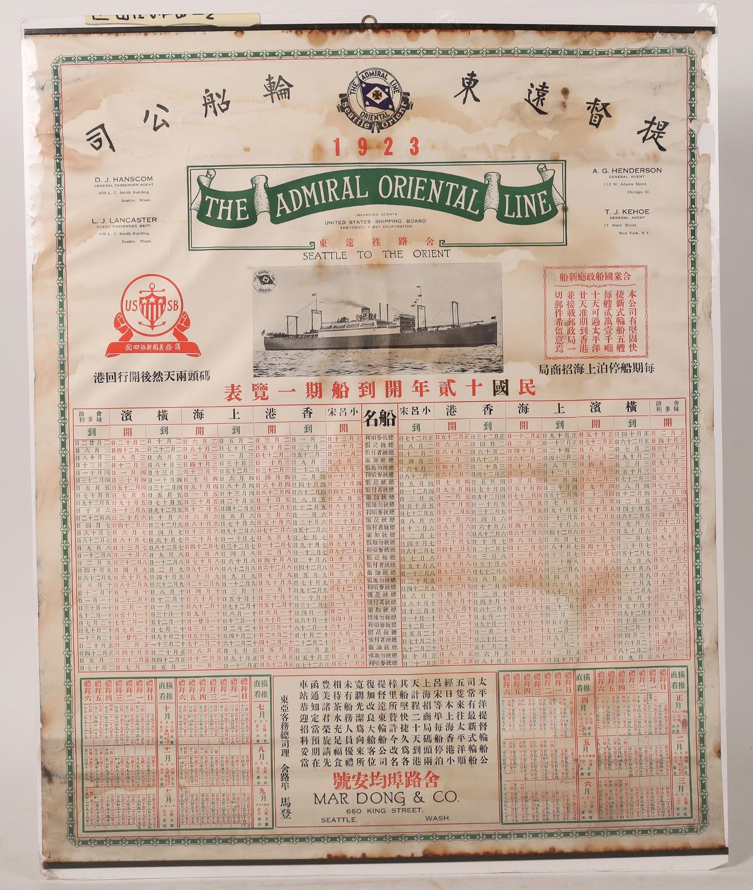 This appears to be a ship's schedule for The Admiral Oriental Line for the year 1923. The line ran passenger and mail service between the Seattle, Japan, Shanghai, China, Yokohama, Kobe, Manila, Honolulu and Hong Kong from 1920 until 1974. This also appears to be in both Japanese and Chinese to serve a majority of their Asian costumers. This piece measures 22"x 28" and is mounted on poster board to keep it protected. A very interesting and attractive wall hanger. Please see photos for more details. Seattle Washington
