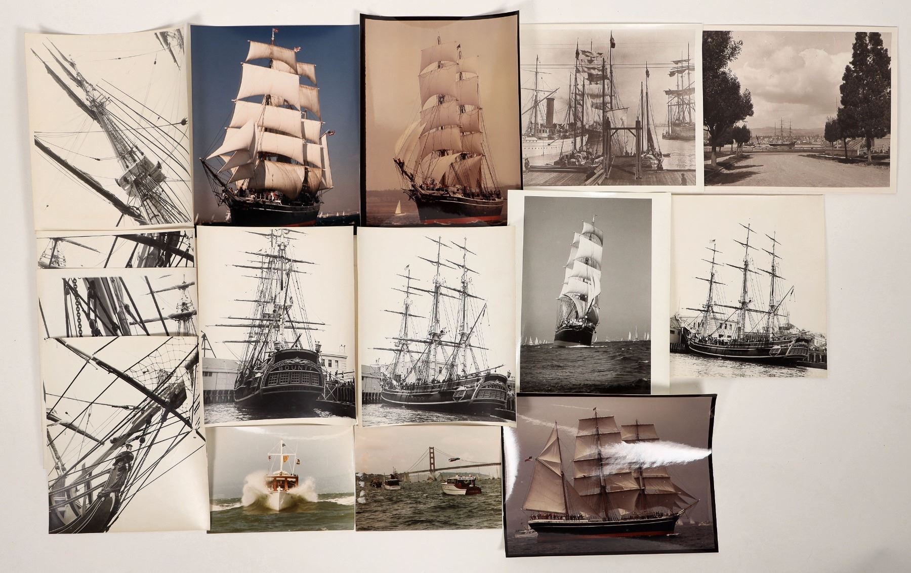 A group of fifteen photographs of boats and ships, ten black and white, five color. Most of the photos picture tall ships, while a few picture small, motor-operated boats. The photos are not dated and have no indication of the photographer; all are in good condition.