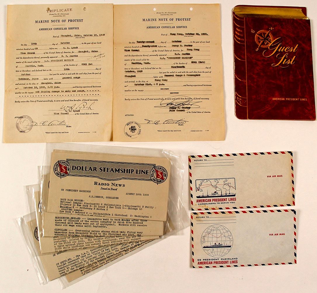 Lot of 12. 1) Dollar Steamship Line. Five Radio News 1929 bulletins issued aboard S.S. President Harrison. Full of news like baseball scores, politics, and Hollywood. 2) Two unused American President Lines Air Mail covers, S.S. President Cleveland. 3) Fancy guest list booklet for a 1955 excursion on the S.S. President Wilson sailing from Honolulu. 4) Two Marine Note of Protest, American Consular Service, 1929, S.S. Madison, Hong Kong and Shanghai. 5) Two other American President Line pieces of ephemera (napkin and ?). (Prag Collection) Date: Location: HWAC# 55407