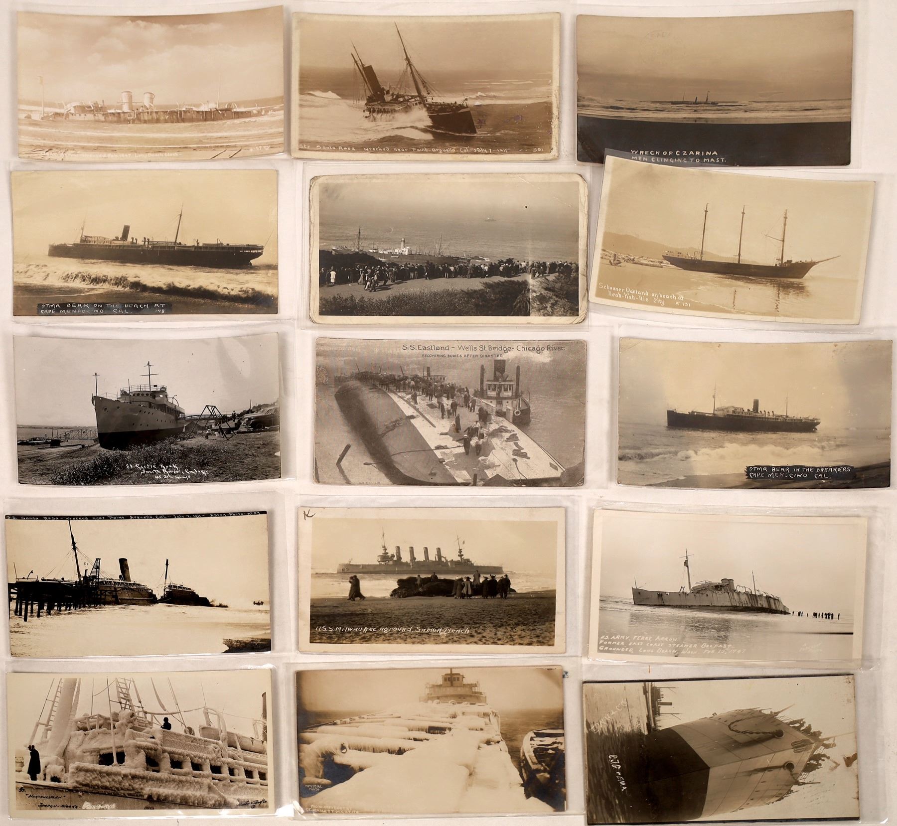 B&W postcards including RPCs depicting ships wrecked and aground. A couple with ships rimed with ice.