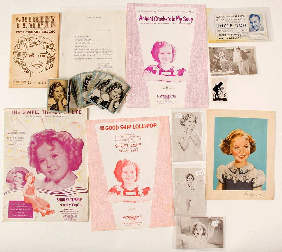 Lot of 13. Includes: c.1938 color print signed by Temple, 7.5 x 10"; signed 1962 letter from Shirley T. Black turning down an invitation to speak; a deck of Shirley Temple bridge playing cards by United States Playing Card Co. (heavy wear including to box); three song books ("Animal Crackers in My Soup," "The Simple Things in Life," "On the Good Ship Lollipop"); Shirley Temple Film Festival Coloring Book c.1965; four 3x5 black and white photographs; and ink blotter advertising Uncle Don and Shirley Temple in "The Little Colonel." (Prag Collection) Date: Location: HWAC# 55662