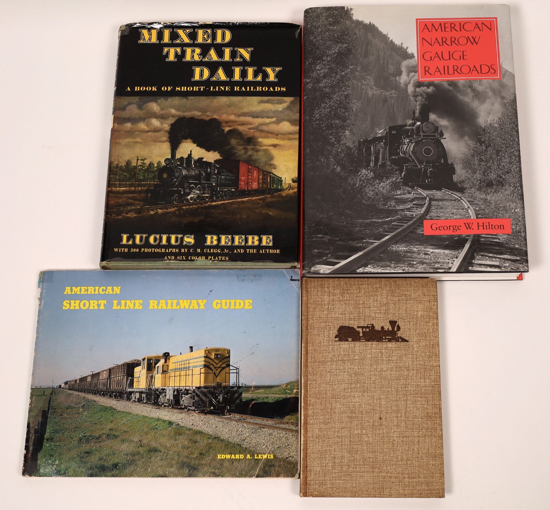A quartet of books dealing with narrow gauge and shoreline railroads throughout the United States. Included are "Narrow Gauge Railroads in America" by Howard Fleming, "Mixed Train Daily" by Lucius Beebe, "American Shortline Guide" by Edward Lewis and "American Narrow Gauge Railroads by George Hilton, the first comprehensive, extensively illustrated account of the growth and decline of American narrow gauge railroading, a singular and still not fully understood episode in the history of American transportation. Dust jackets intact. Please see photos for more detail and condition.