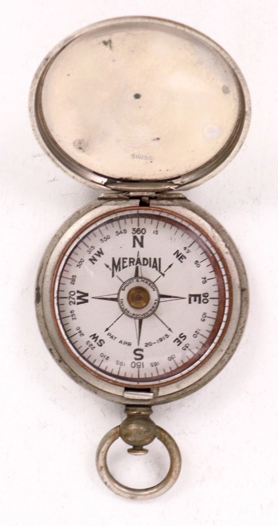 This is the Meradial model compass made by Short & Mason of Rochester, New York with a 1915 patent date. Nickel silver case without dents still accurate. Please see photo for details.